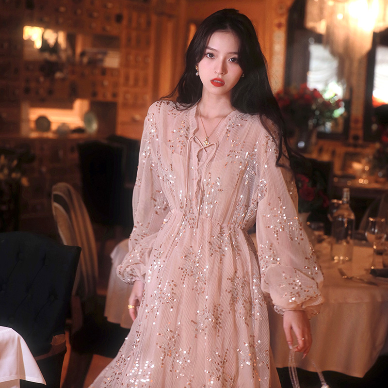 AZure 灯笼袖压皱亮片连衣裙 粉色bling长裙气质公主裙复古雪纺裙