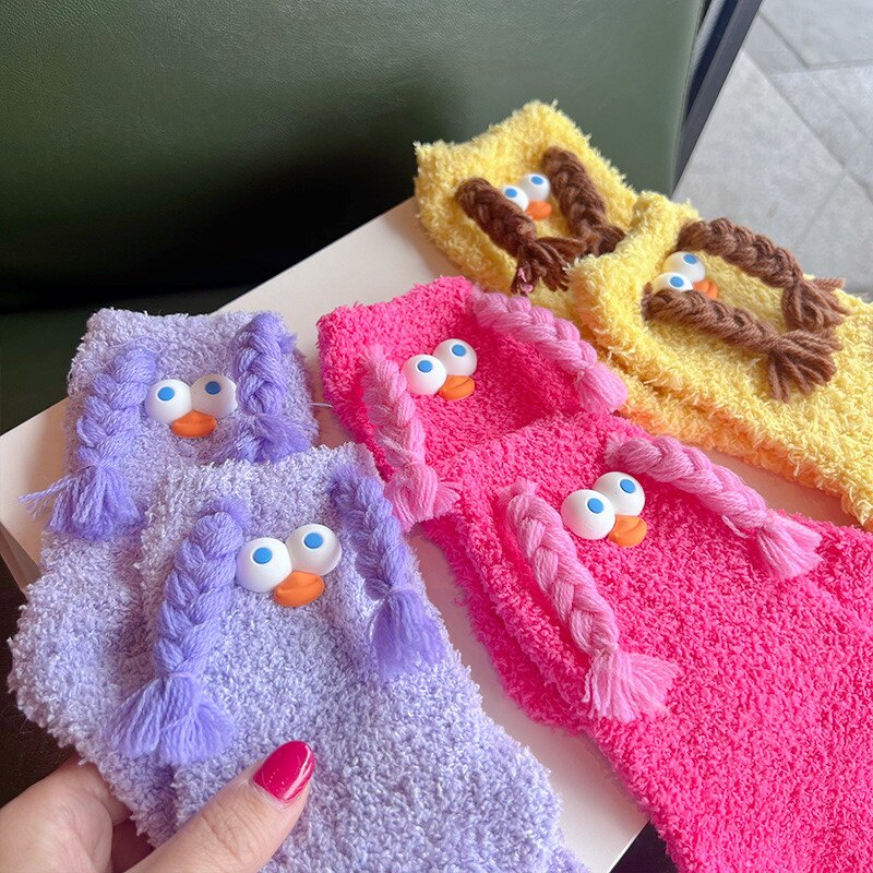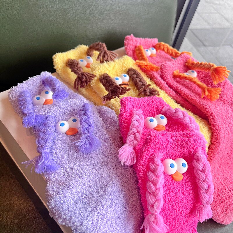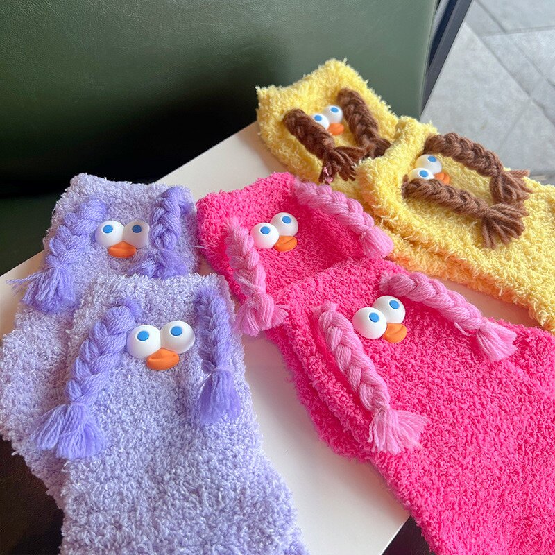 长辫子大眼毛绒袜子珊瑚绒加厚秋冬多巴胺色毛毛中筒百搭堆堆袜子
