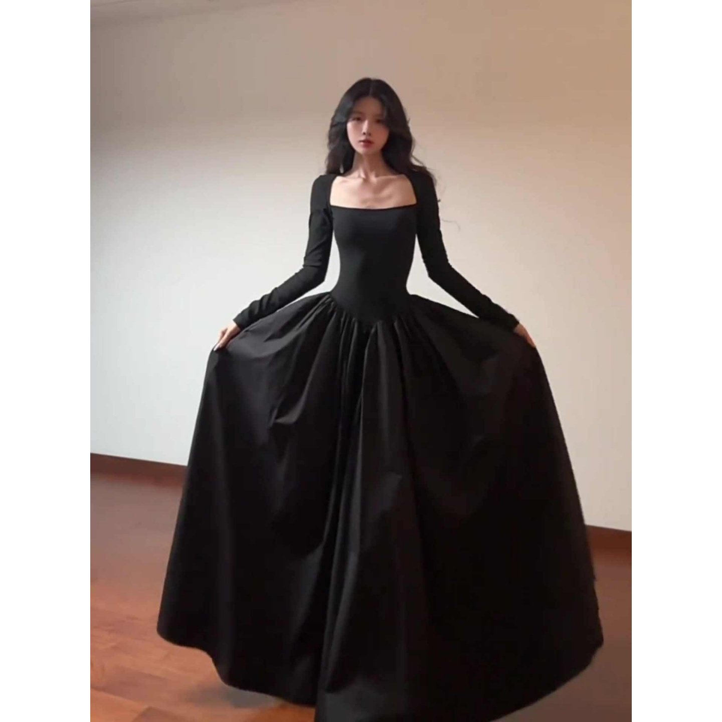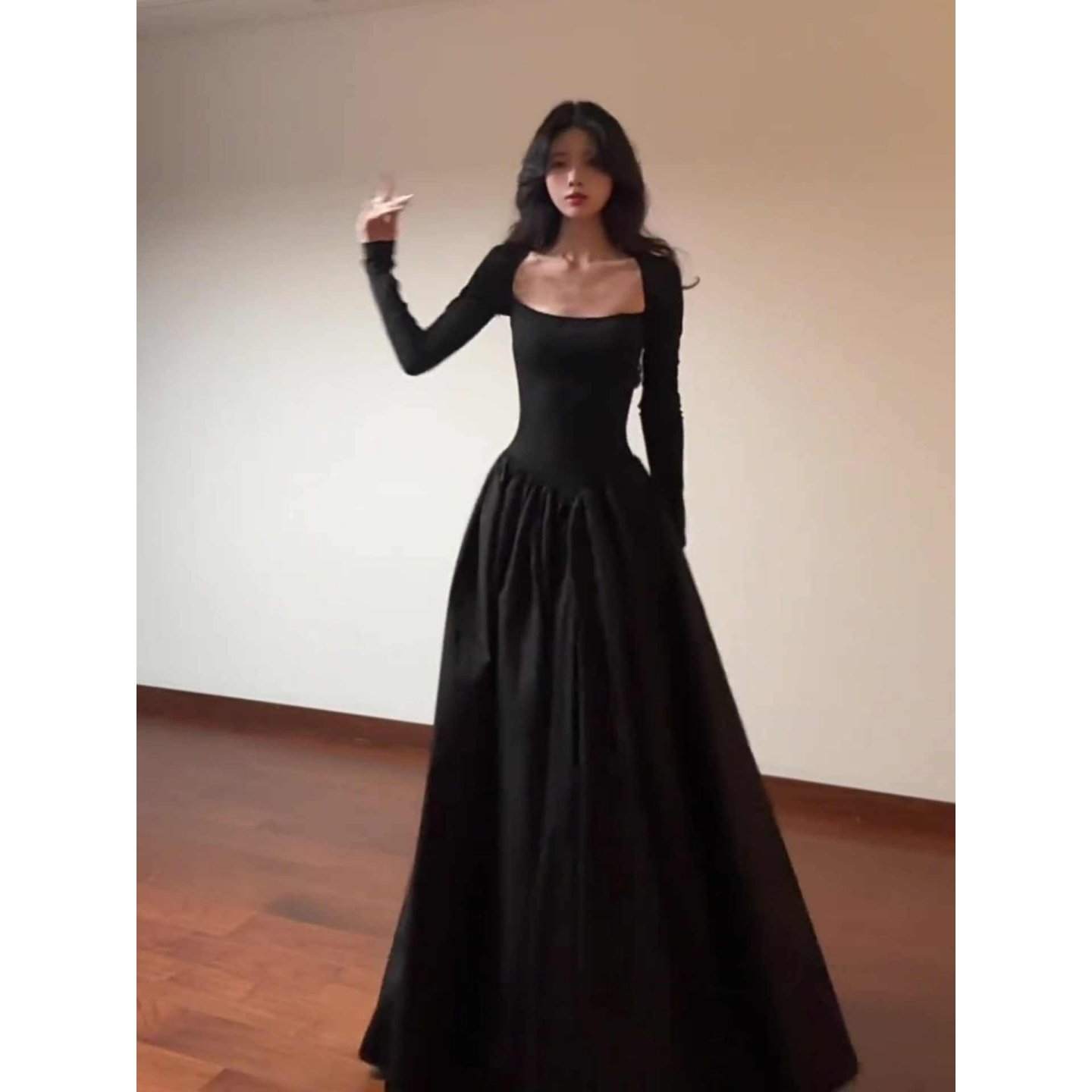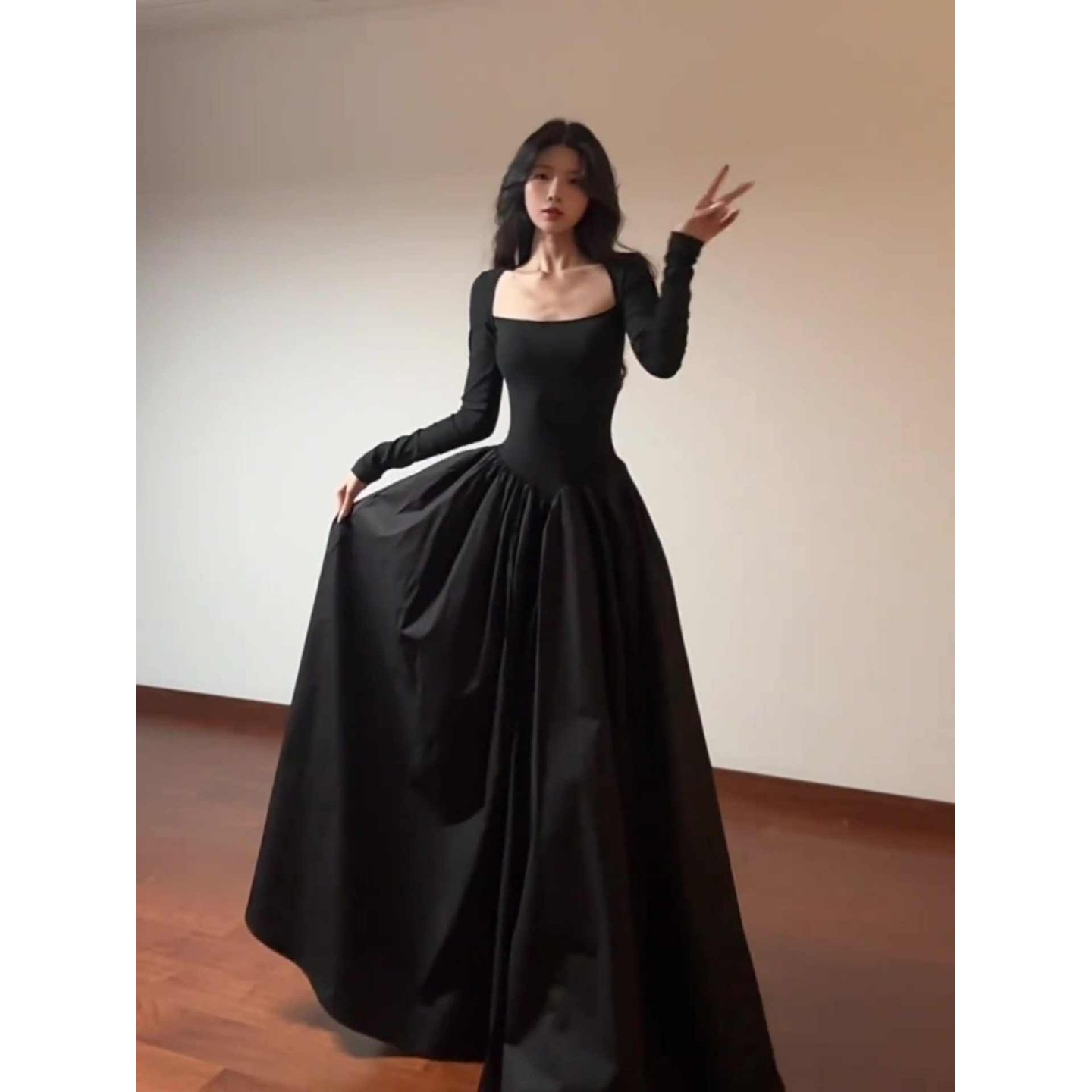 大码胖mm赫本风黑色气质修身方领连衣裙秋季新款高级收腰大摆长裙
