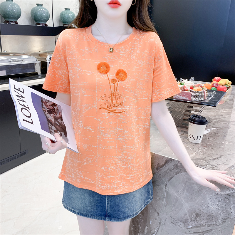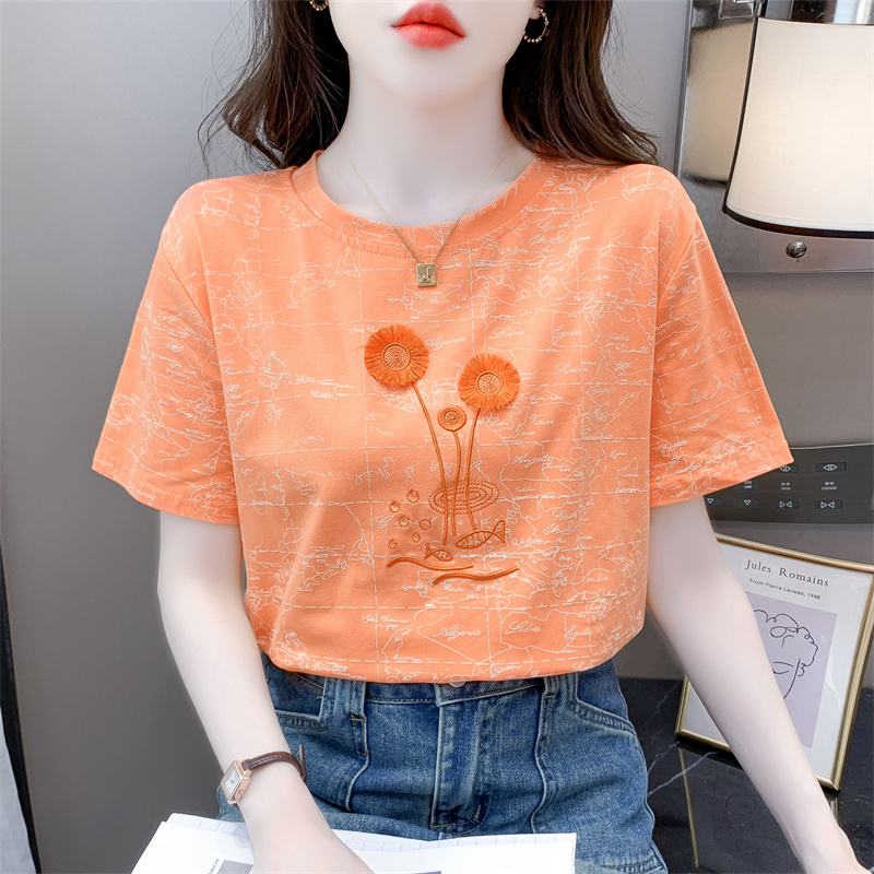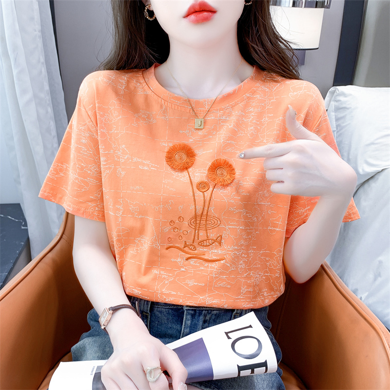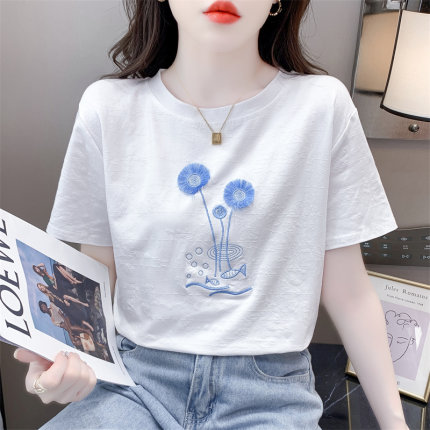 纯棉白色T恤女夏装新款圆领刺绣设计感打底衫宽松洋气短袖女上衣