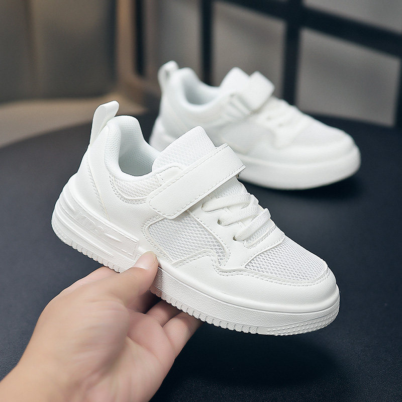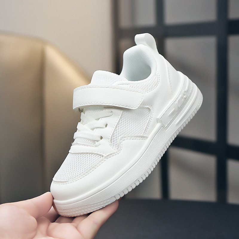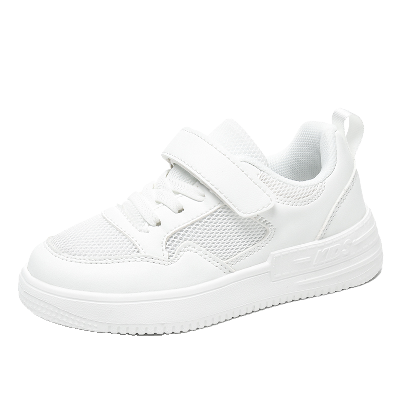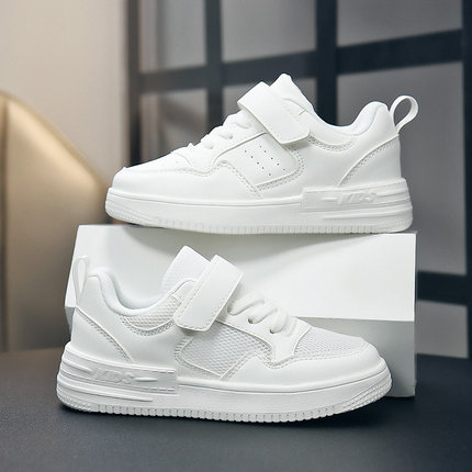 新款男女儿童小白鞋春秋季网布透气运动鞋皮面防水板鞋学校表演鞋