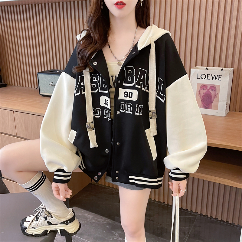 撞色棒球服外套女2023新款秋冬韩版宽松加绒加厚百搭夹克开衫卫衣