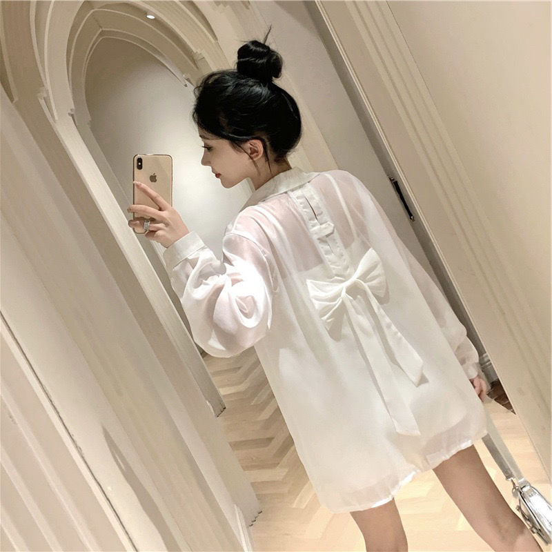 白色雪纺衬衫女夏季薄款冰丝空调防晒衬衫露背蝴蝶结上衣开衫外套