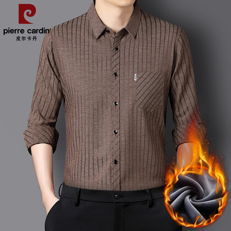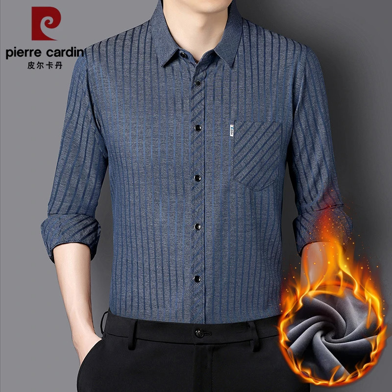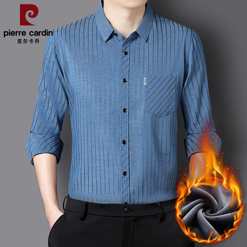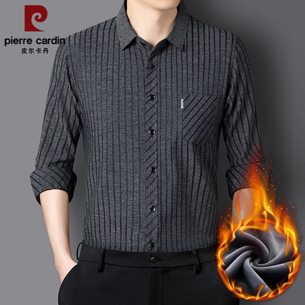 皮尔卡丹秋冬新款男士桑蚕丝加绒衬衫长袖加厚保暖弹力无痕衬衣男