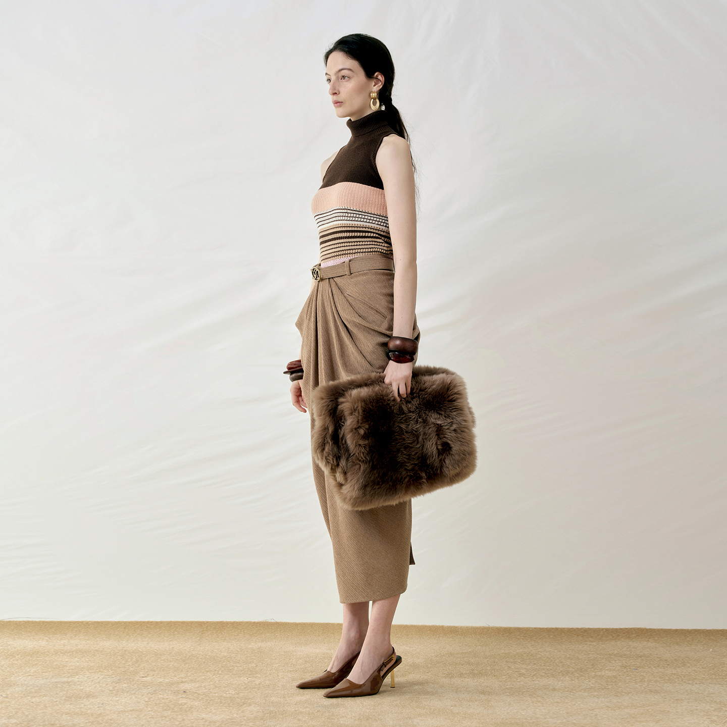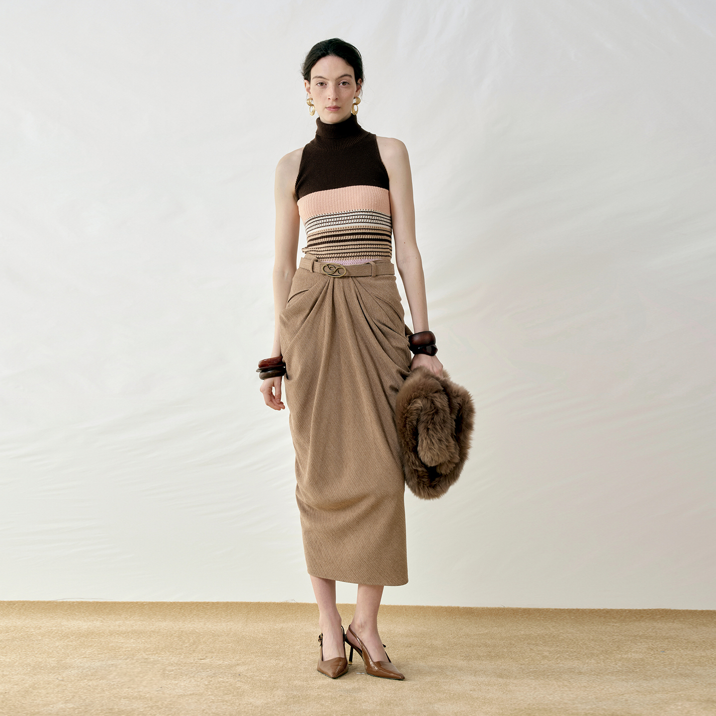 Cello Sonata彩色条纹坎肩高领背心褶皱腰带中裙女CHENSHOP设计师