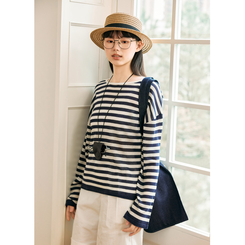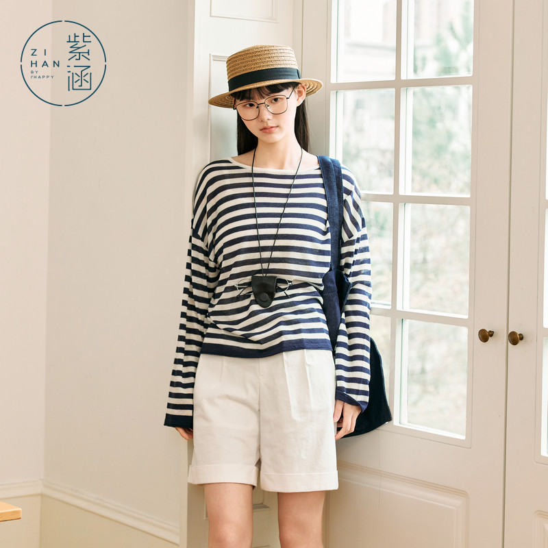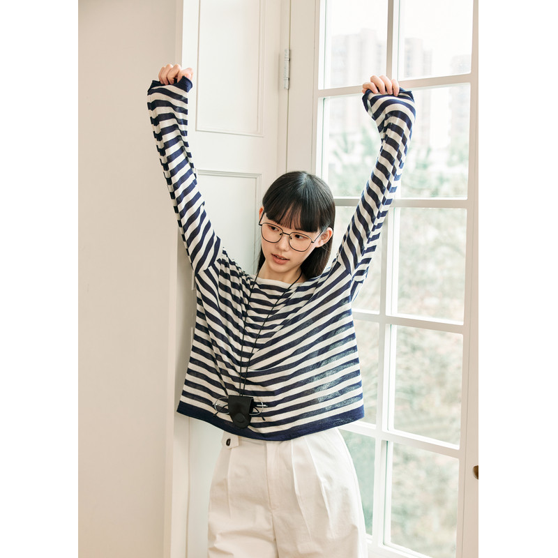 紫涵条纹长袖针织T恤女2025年夏季新款镂空露背宽松遮阳罩衫上衣