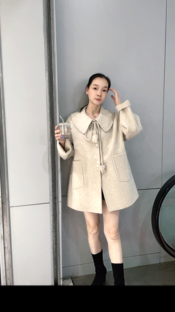 学院风网红羊绒大衣呢外套韩版中长款外翻领挽袖款羊毛上衣
