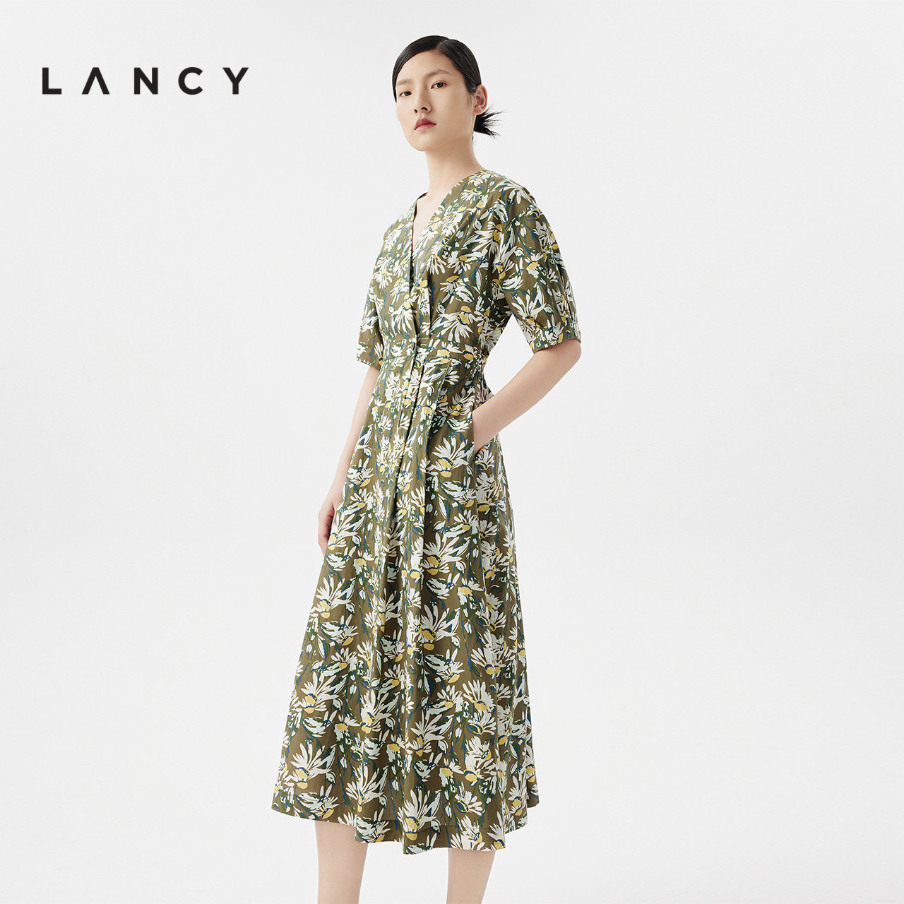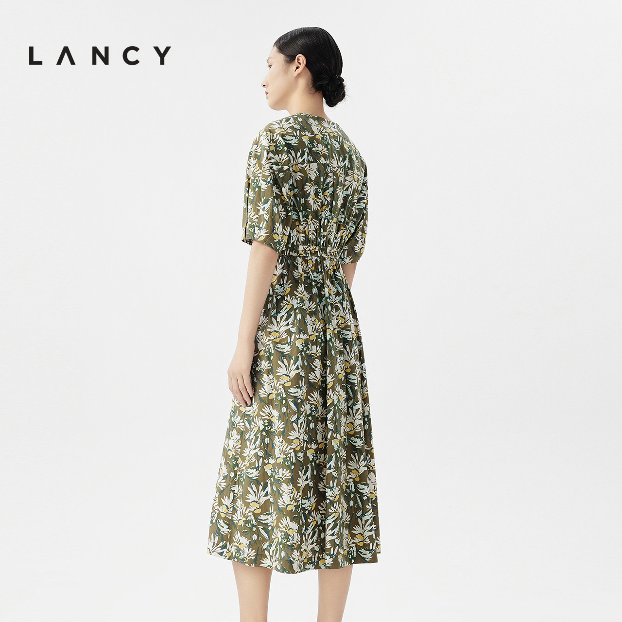 LANCY/朗姿2024夏季新款法式v领印花连衣裙复古碎花收腰气质裙子