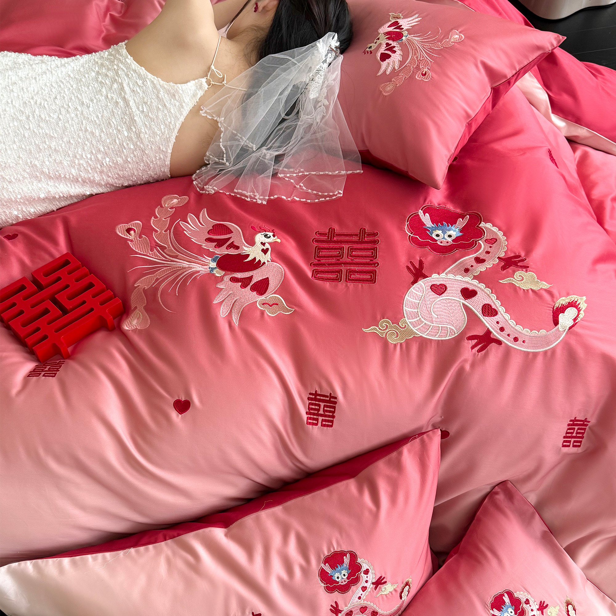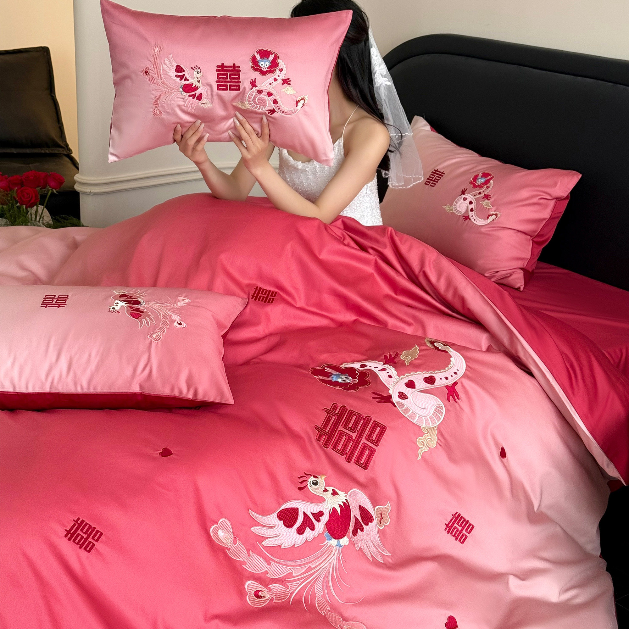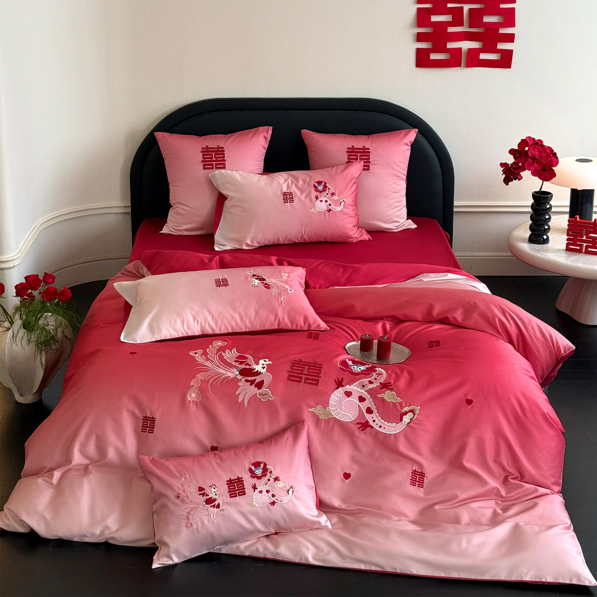 新婚卡通龙凤刺绣婚庆四件套全棉长绒棉渐变红色结婚被套床单床笠