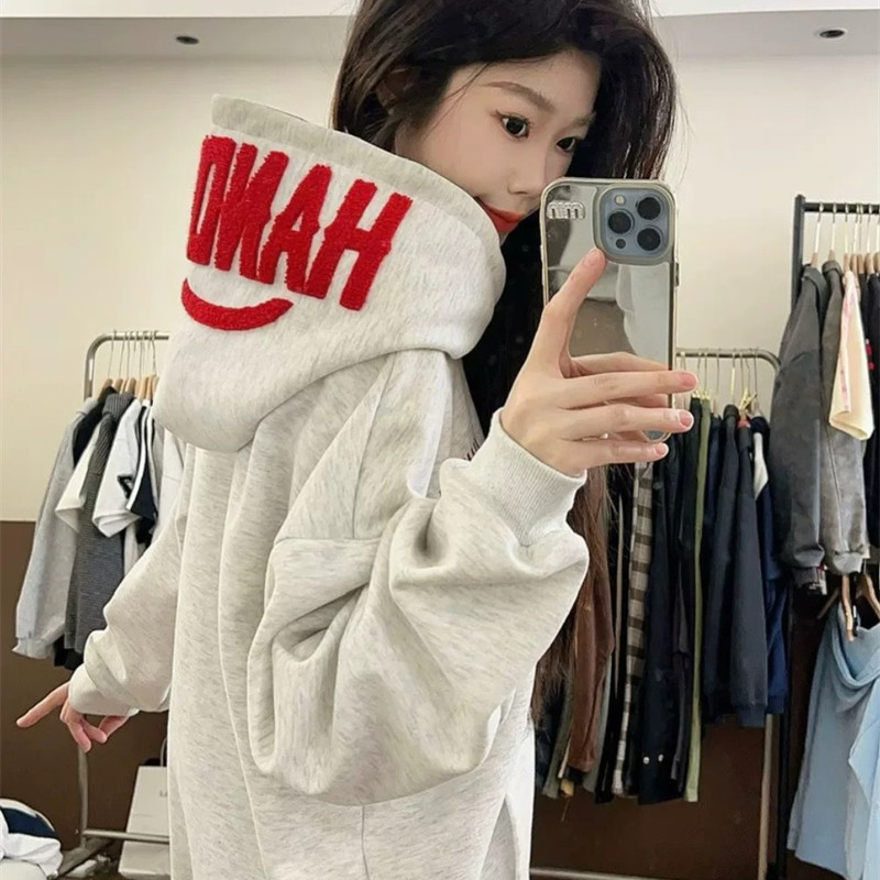 美式复古字母毛巾刺绣连帽卫衣女秋冬新款加绒加厚宽松设计感外套