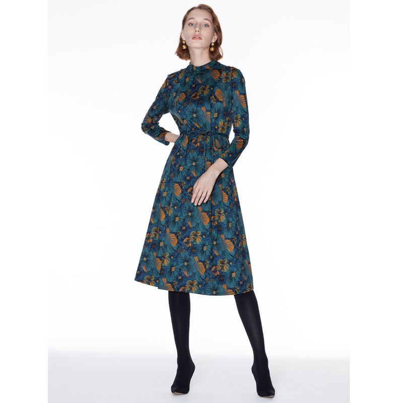 沐兰商场同款复古印花连衣裙2025年春季新款小立领腰A字裙中长款