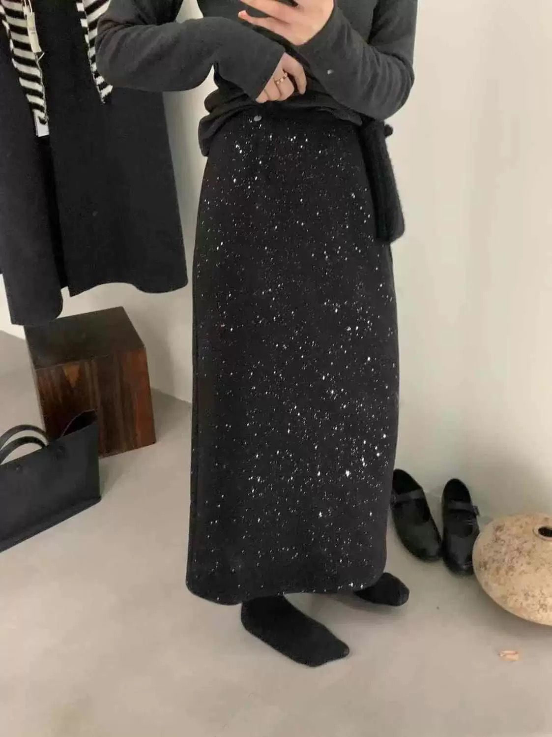 折扣加绒毛呢冬设计感半身裙女松紧腰显瘦亮片包臀中长裙百搭潮女