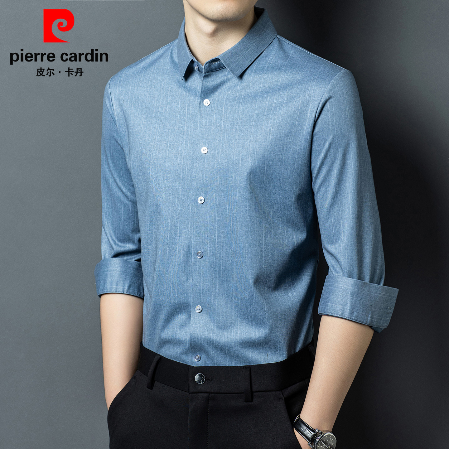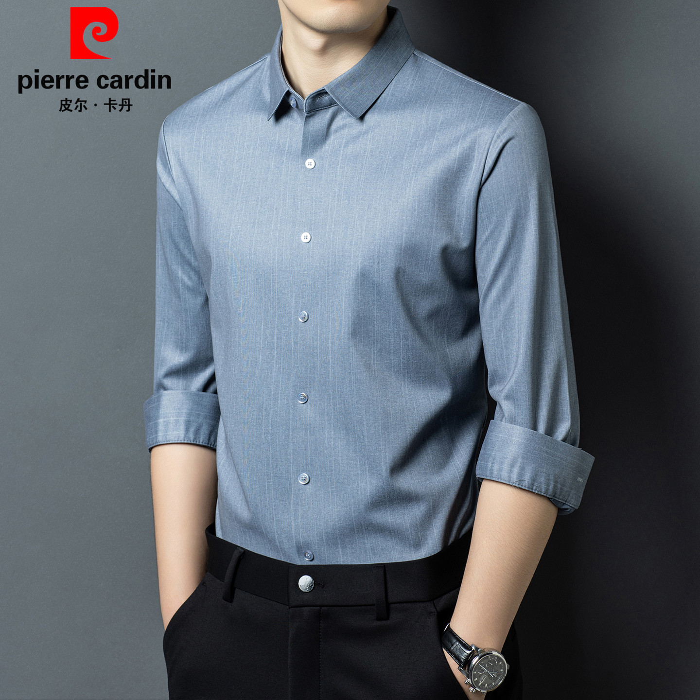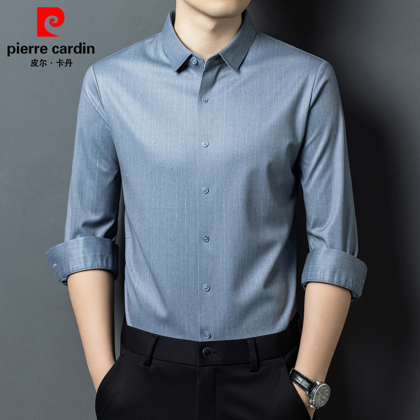 皮尔卡丹春季高档男士无痕长袖衬衫中年商务休闲免烫翻领免烫衬衣