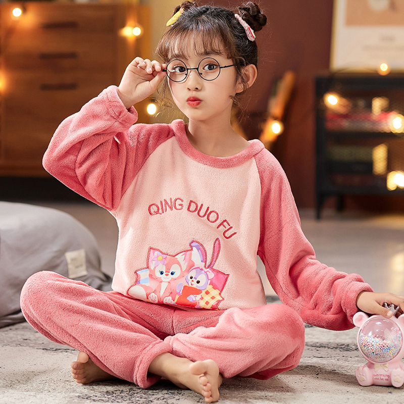 2025秋冬季新款法兰绒睡衣女童网红卡通可爱儿童珊瑚绒家居服套装