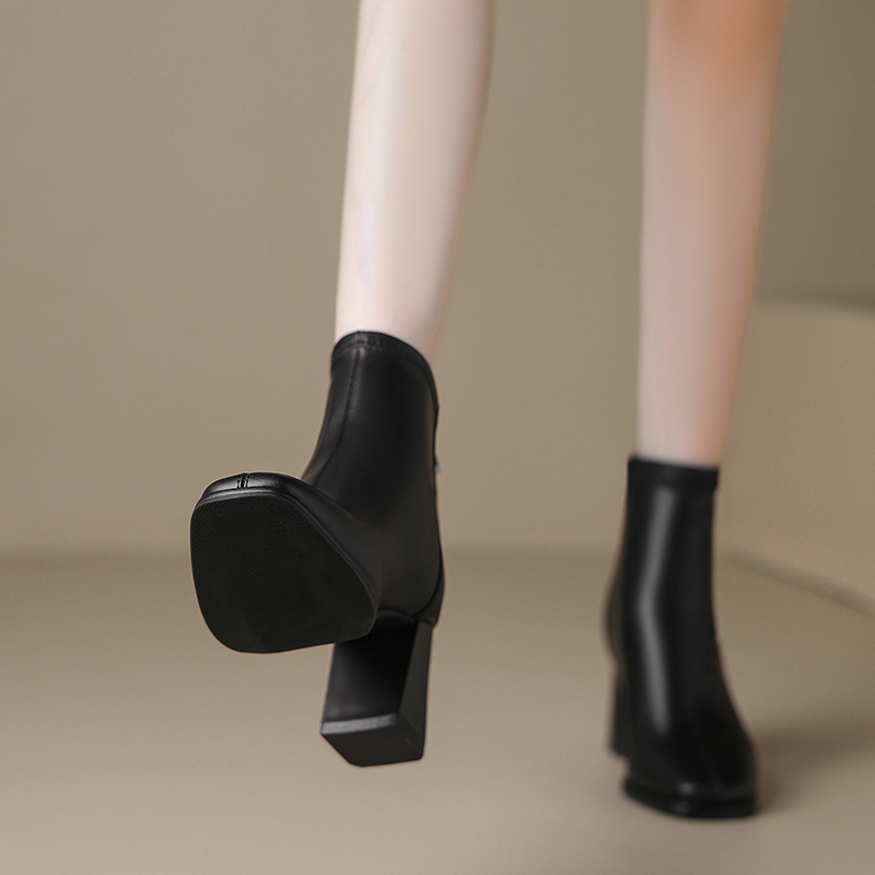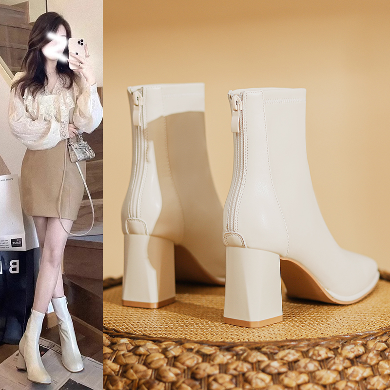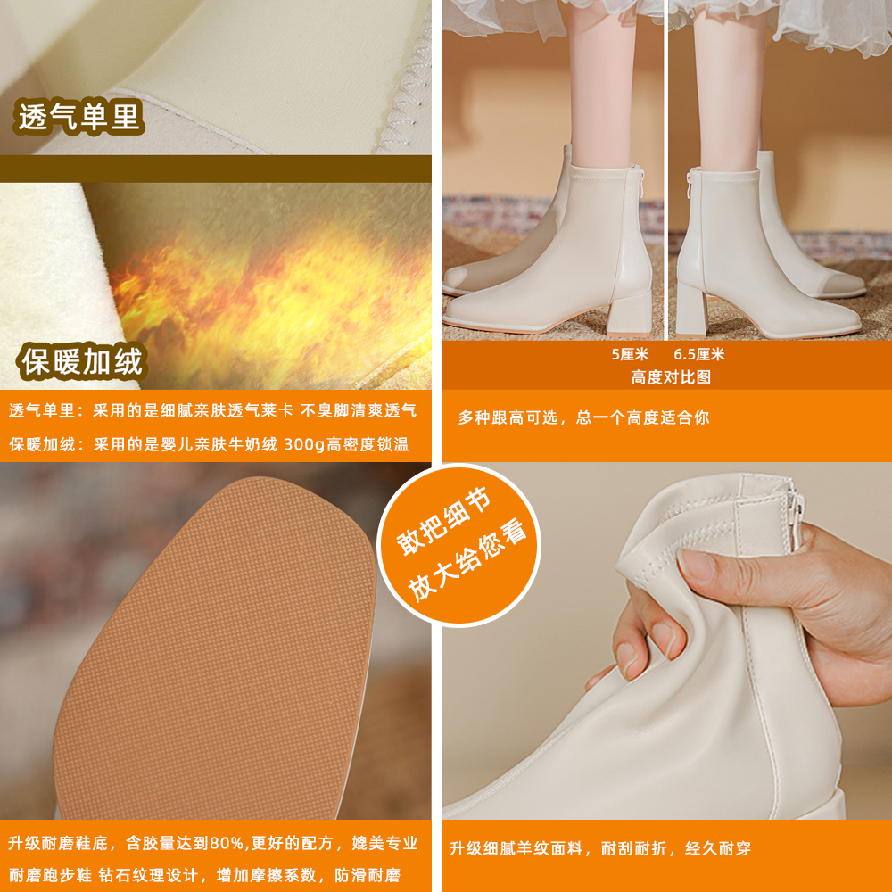 真皮白色高跟短靴女2025春秋新款配裙子的小短踝靴子粗跟皮鞋加绒