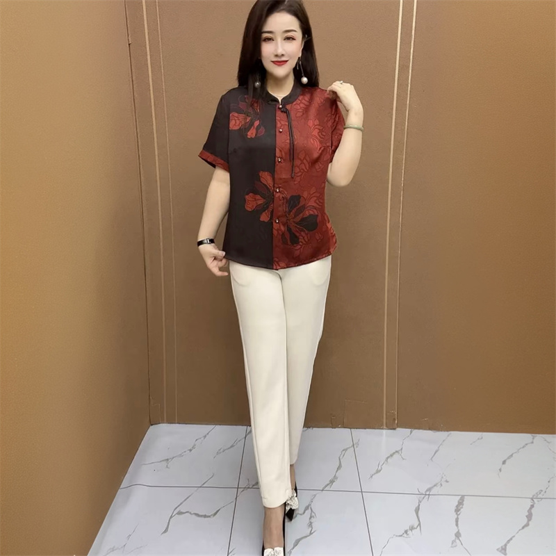 高端气质夏季短袖新中式真丝旗袍开衫中老年妈妈衬衫遮肉显瘦上衣