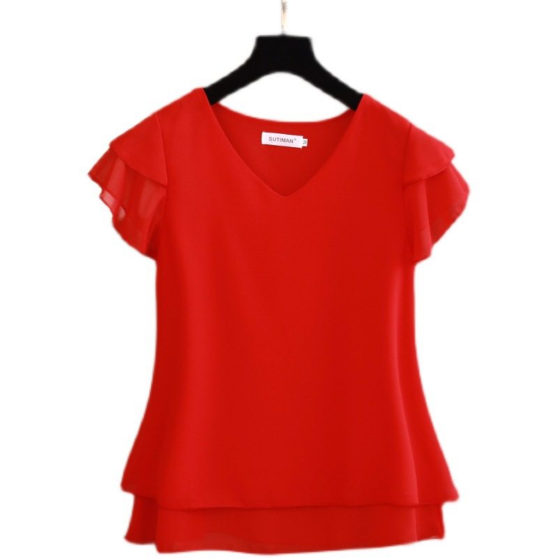 欧洲站雪纺衫短袖女夏季新款V领宽松大码上衣遮肚子洋气t恤打底