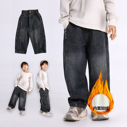 【小李专享】【顾奈】儿童加绒牛仔裤拼接弯刀牛仔裤NZK25336