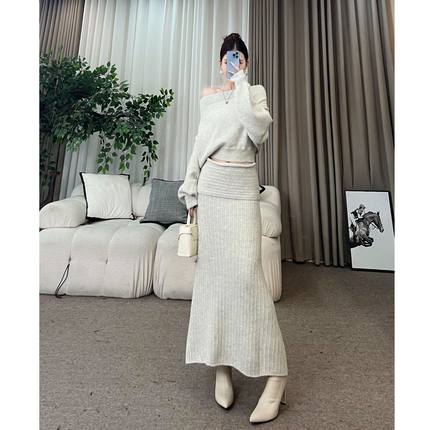 XIAOQIN【留白日记】秋冬针织斜肩上衣翻边半身鱼尾长裙套装T582