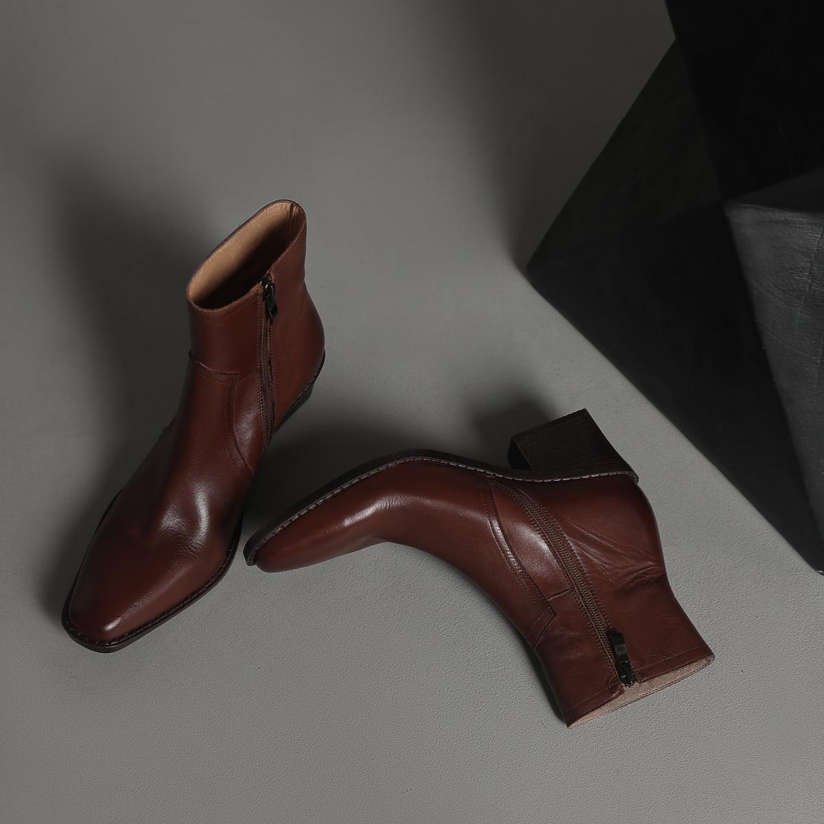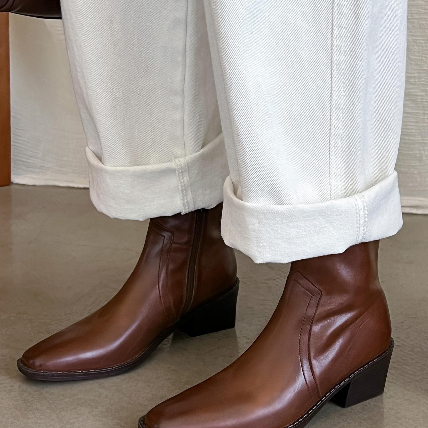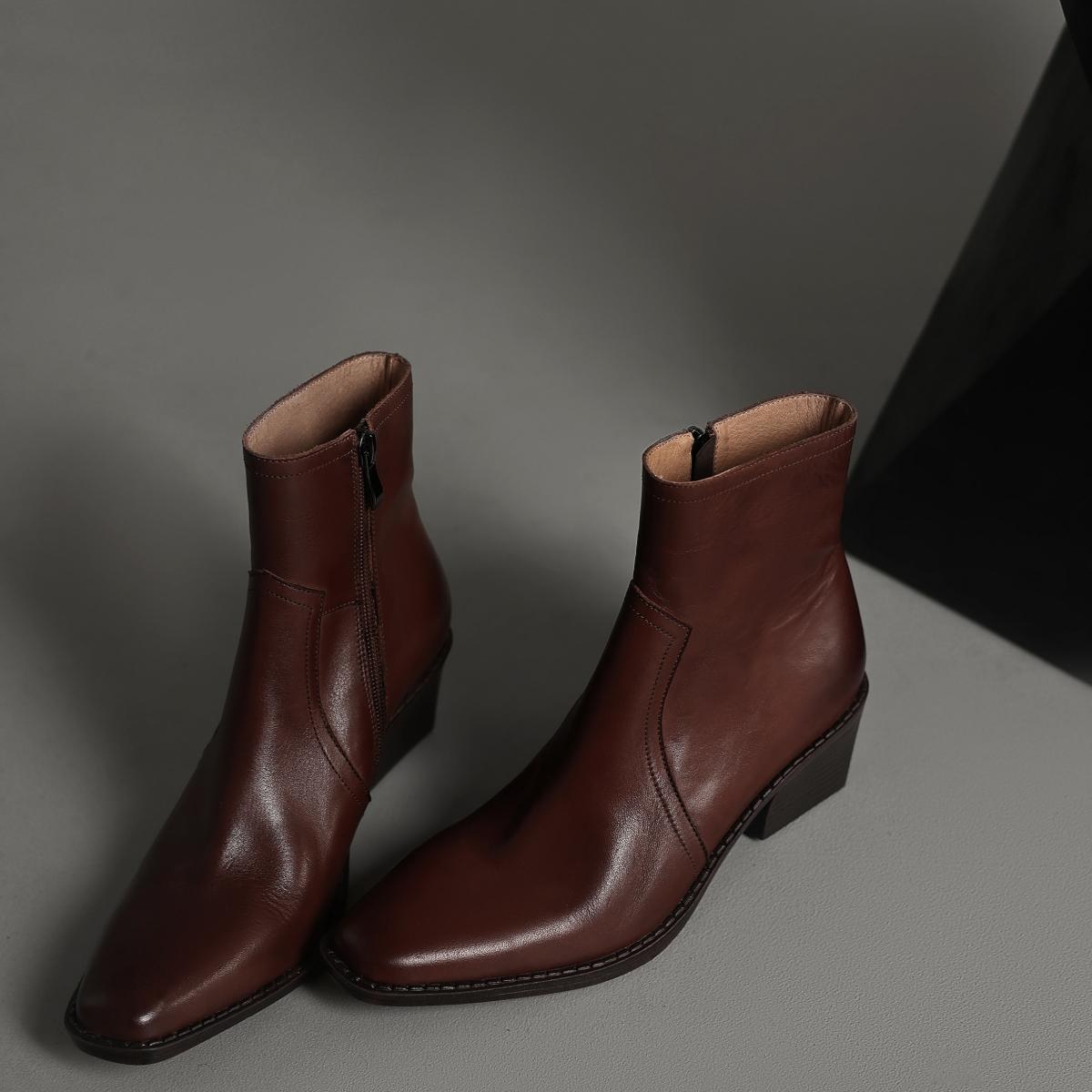 2024年冬季新粗跟切尔西短靴水洗牛皮擦色真皮方头法式短靴高品质