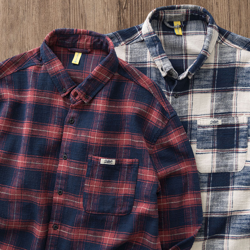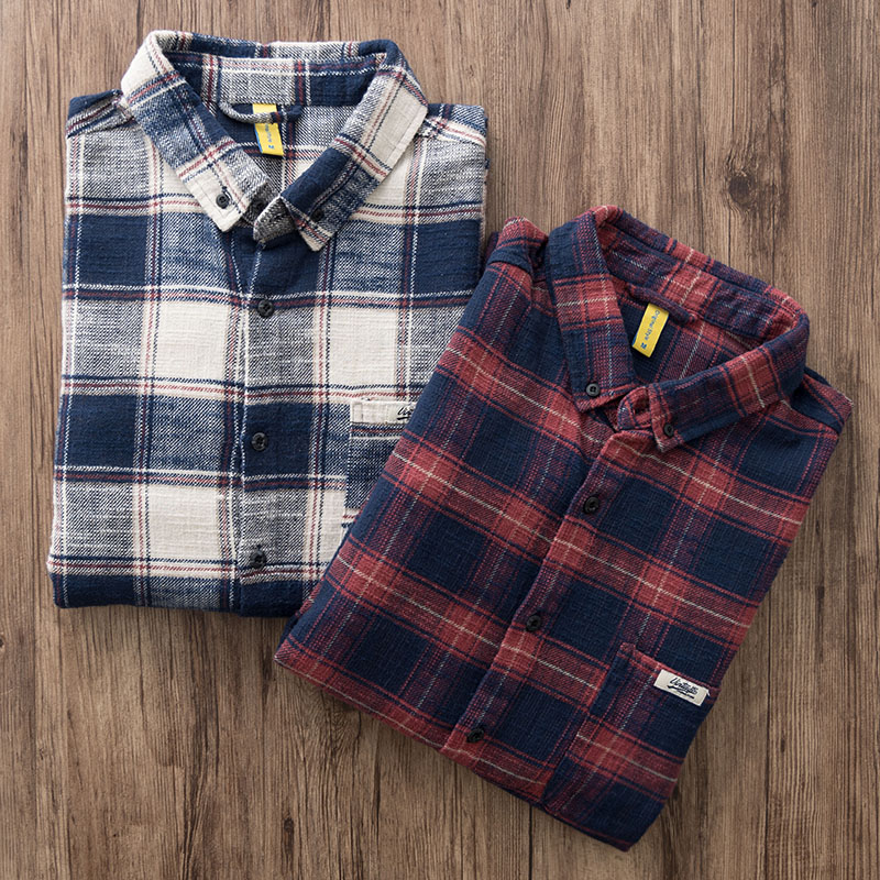 重磅美式复古磨毛格子衬衫男士阿美咔叽宽松纯棉工装长袖衬衣男
