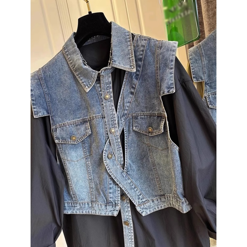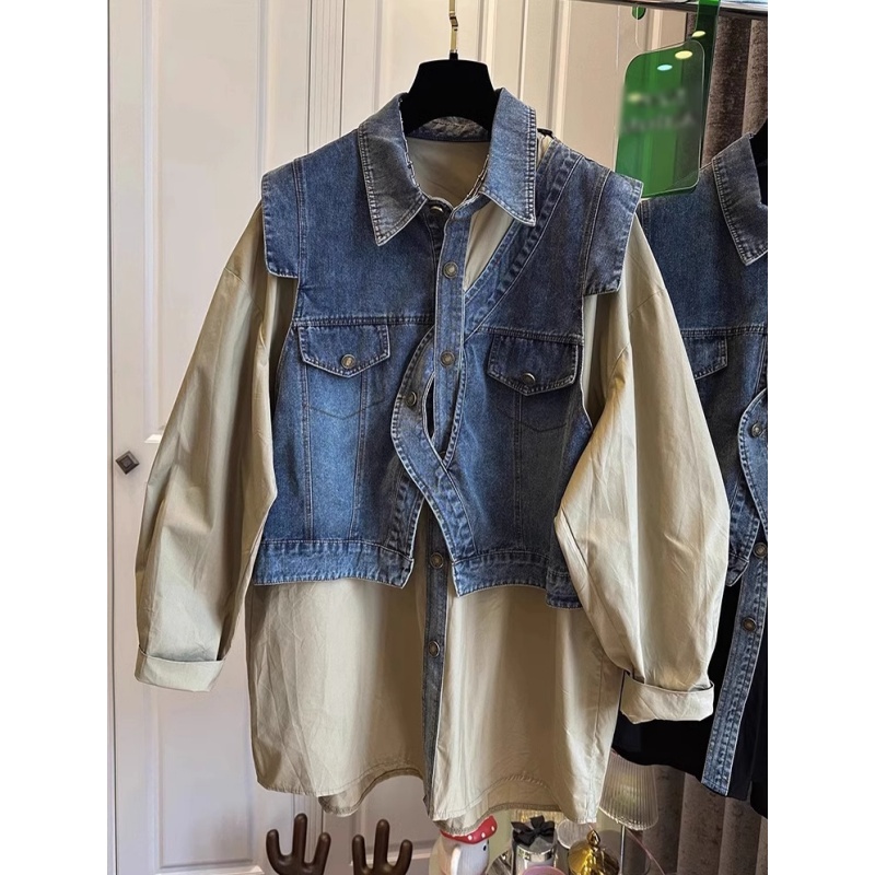 设计感小众牛仔拼接衬衫女春秋季大码胖mm宽松遮肚显瘦假两件上衣