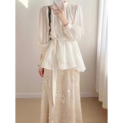 韩国chic春季优雅气质立领系带收腰衬衫+亮片点缀鱼尾半身裙套装