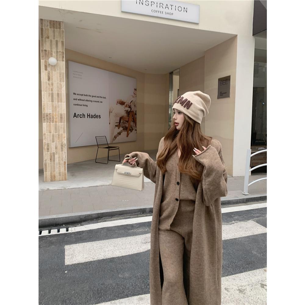 草莓少女!慵懒风套装中长款毛衣外套针织马甲休闲阔腿长裤三件套