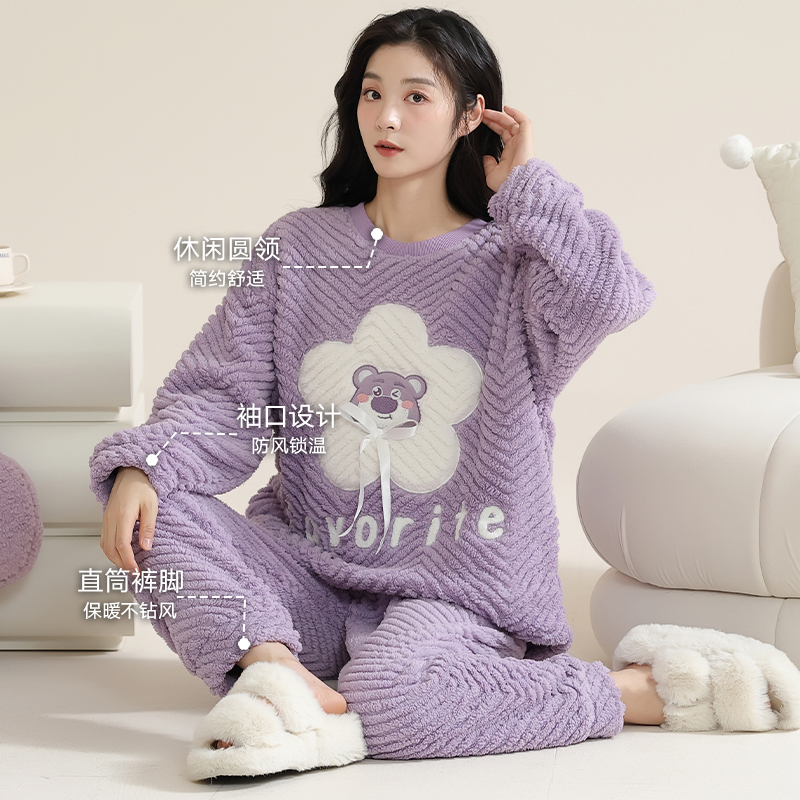 雅鹿珊瑚绒女睡衣法兰绒秋冬季保暖加绒加厚家居服套装新款可外穿