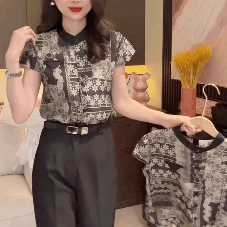 气质碎花雪纺立领短袖T恤衬衫女