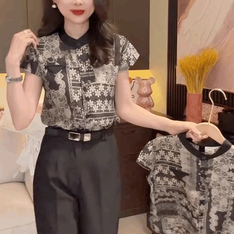 气质碎花雪纺立领短袖T恤衬衫女法式打底衫复古高端百搭黑色上衣