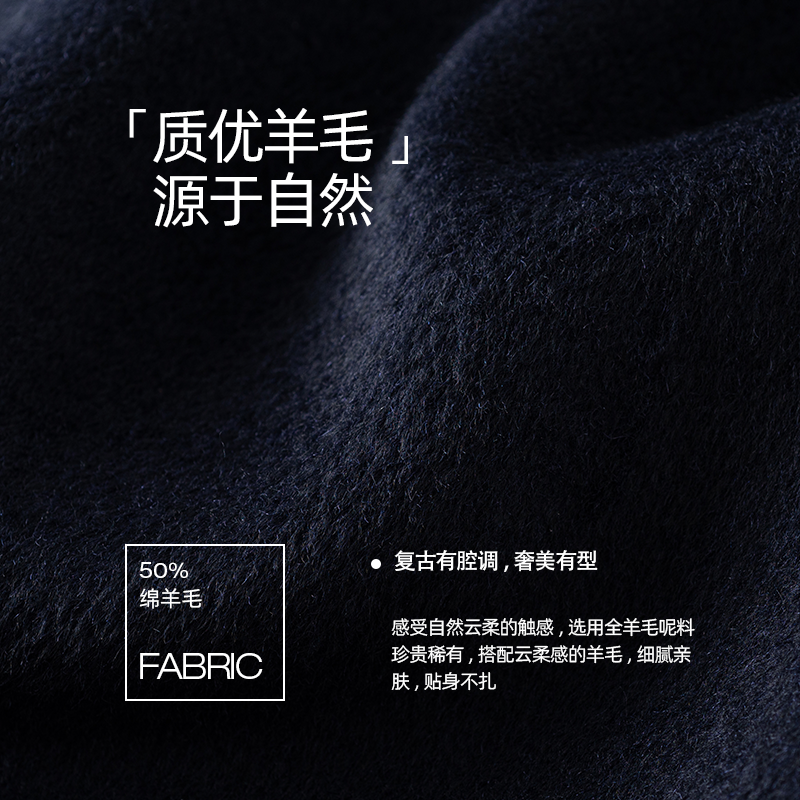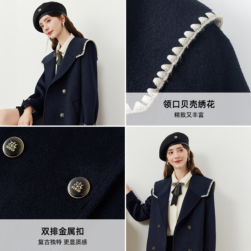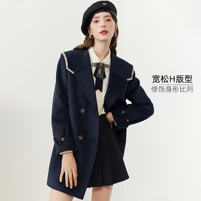 KBNE藏青色毛呢外套双排扣大衣2025新款百搭长袖双面呢风衣秋冬女