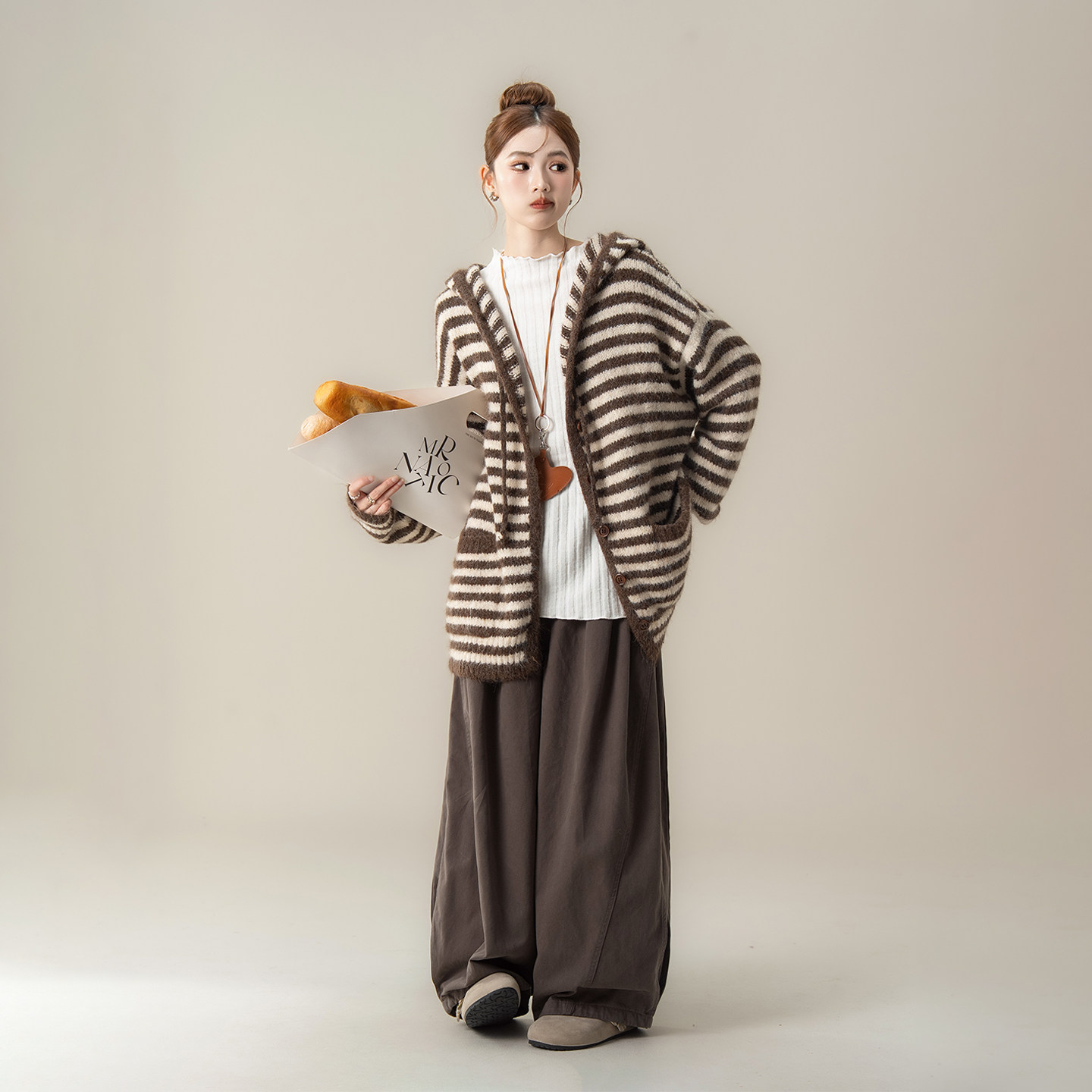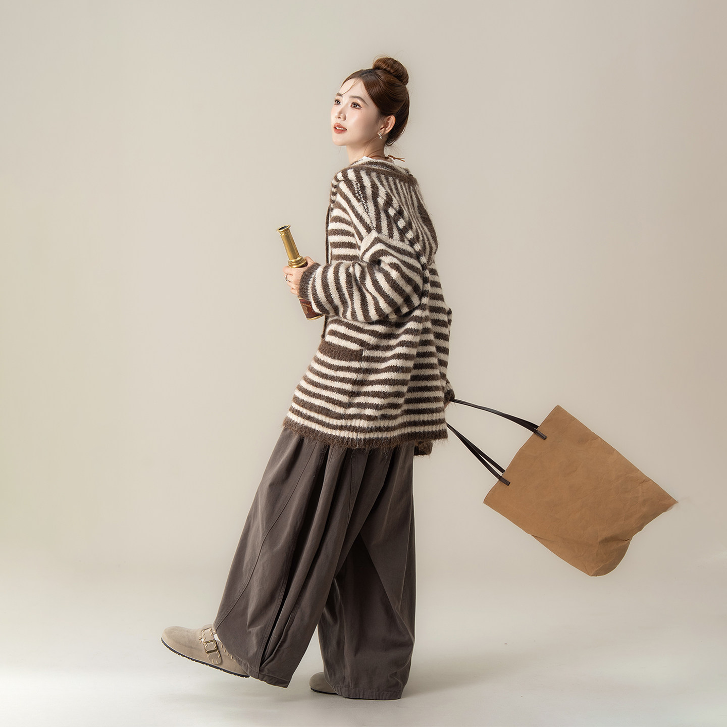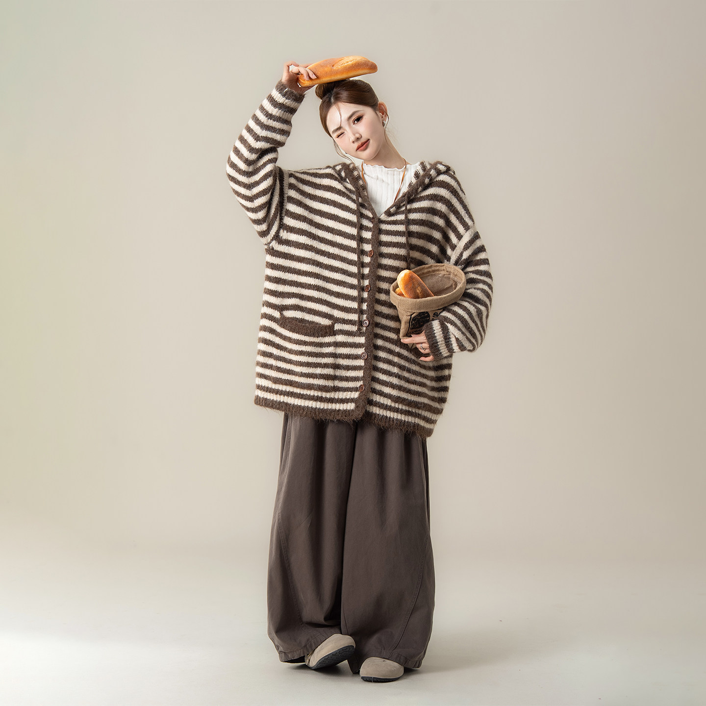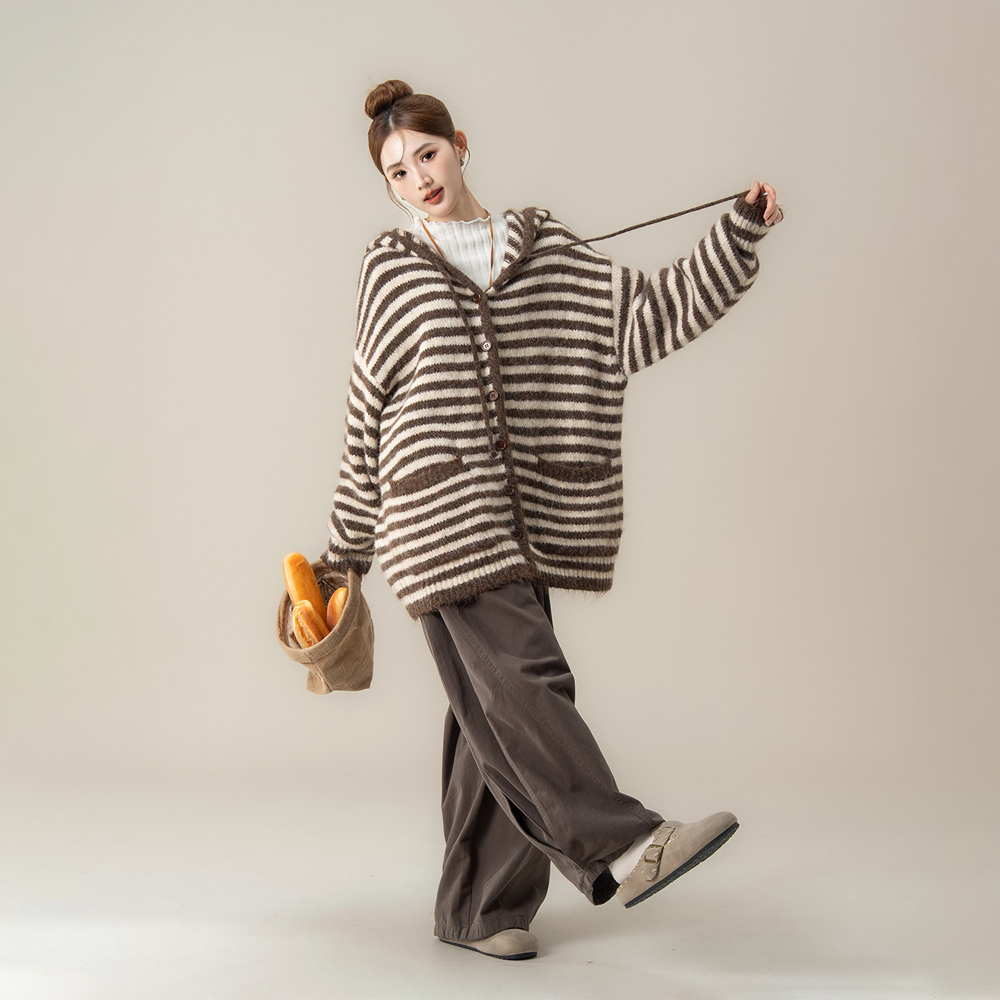 咖色宽松软糯条纹连帽针织开衫女
