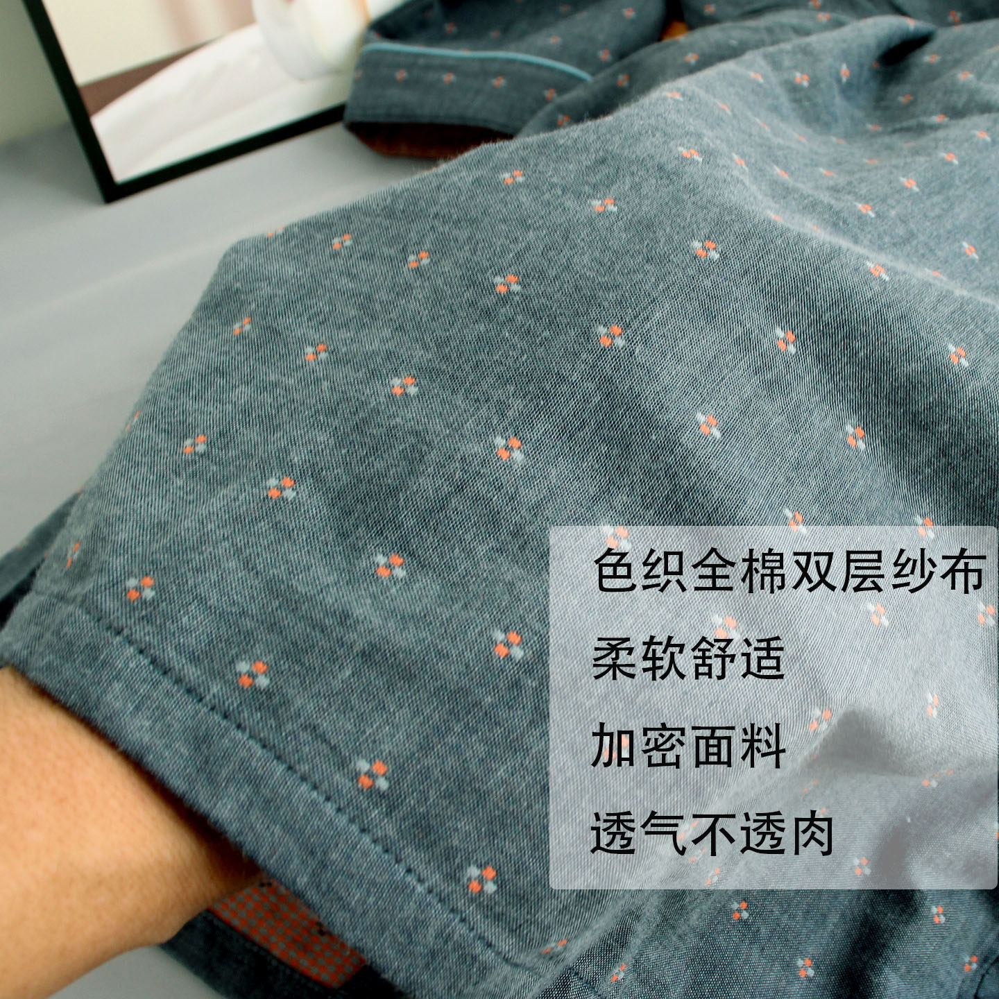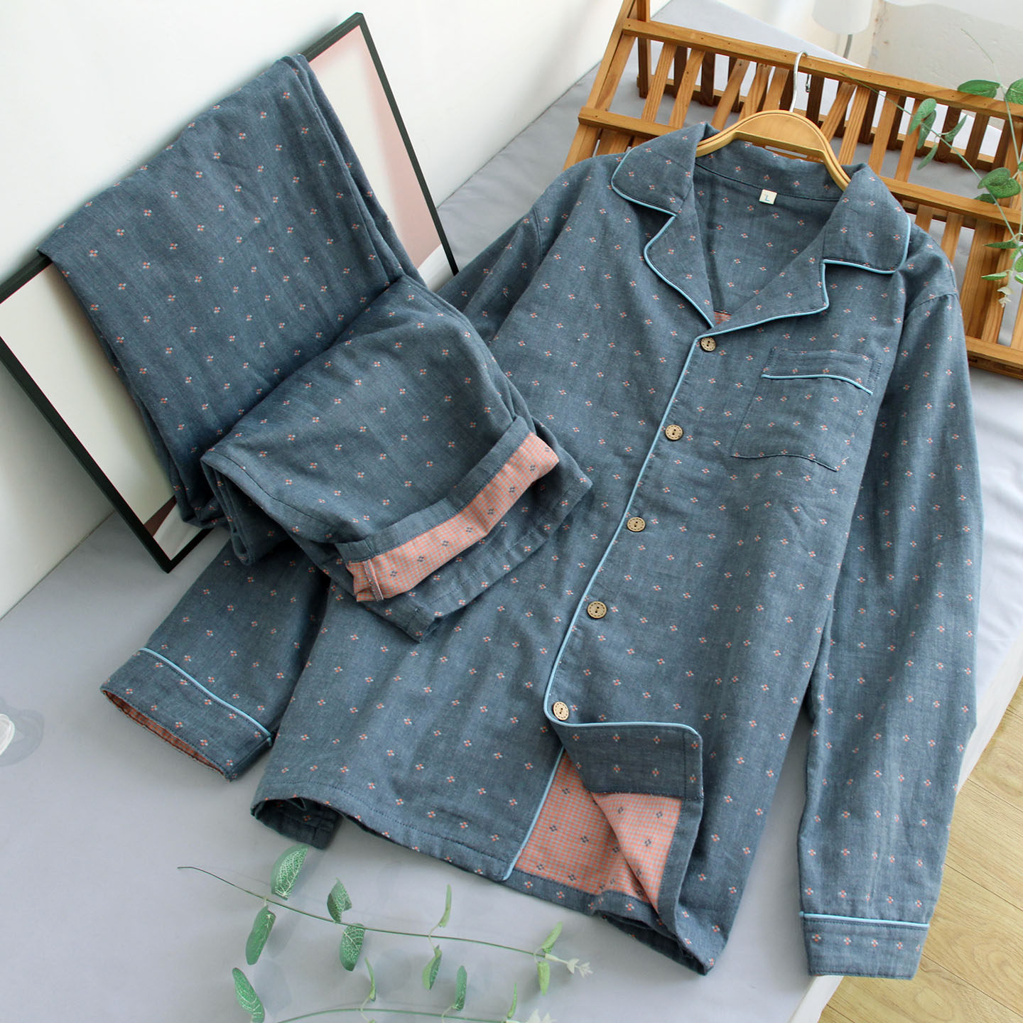 男长袖长裤睡衣色织提花双层纱布