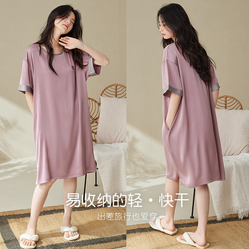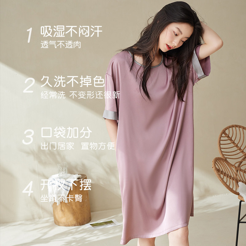 夏季冰丝睡裙女薄款短袖休闲中长款仿真丝绸睡衣可外穿连衣裙夏天