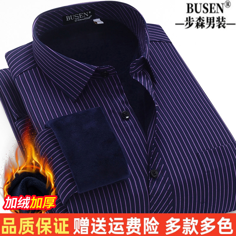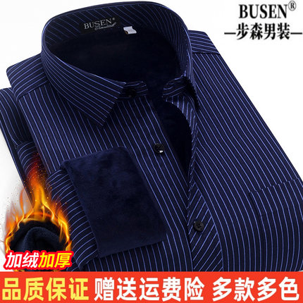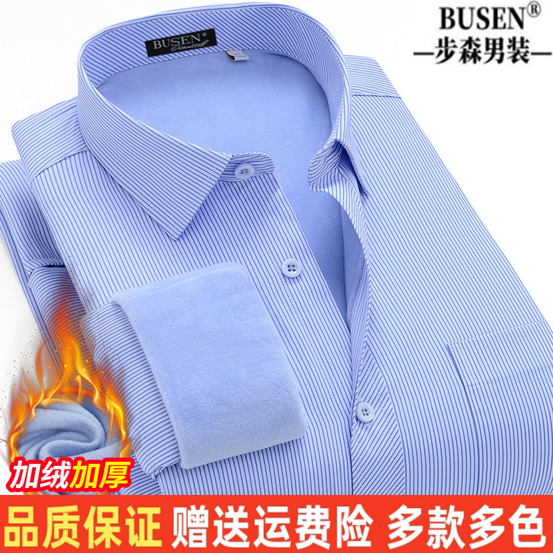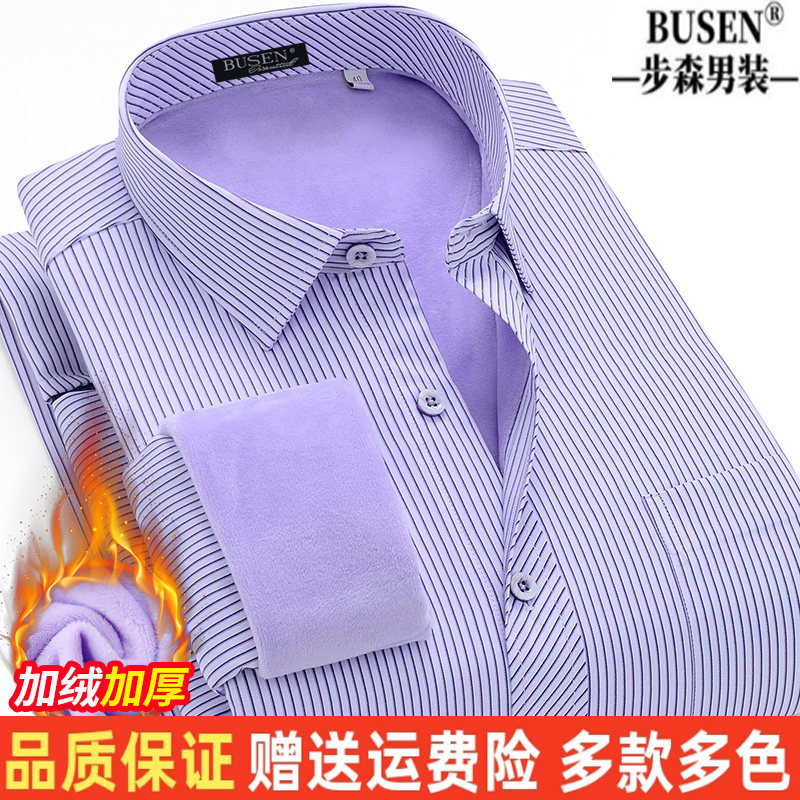 步森纯棉免烫保暖衬衫男士加绒加厚商务职业正装条纹上班西装衬衣