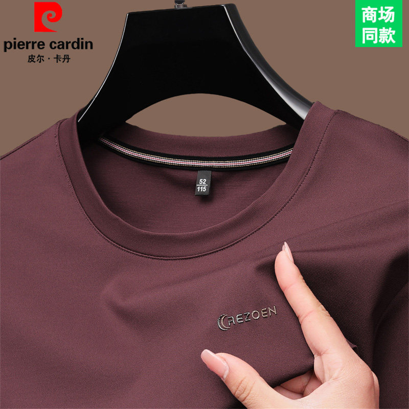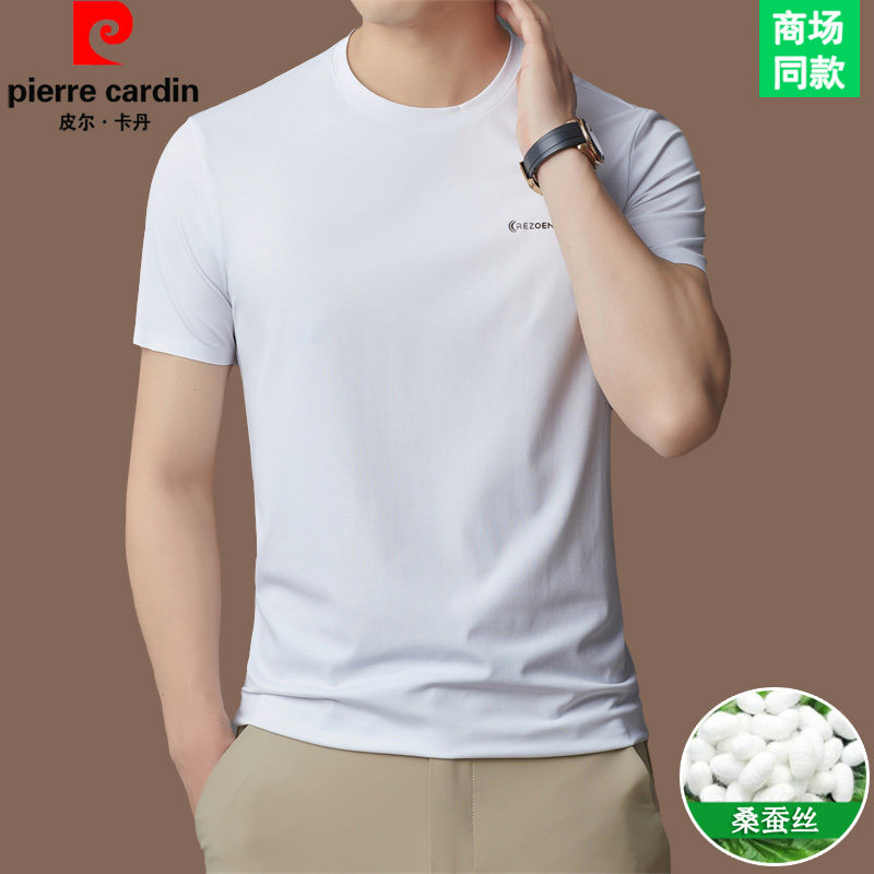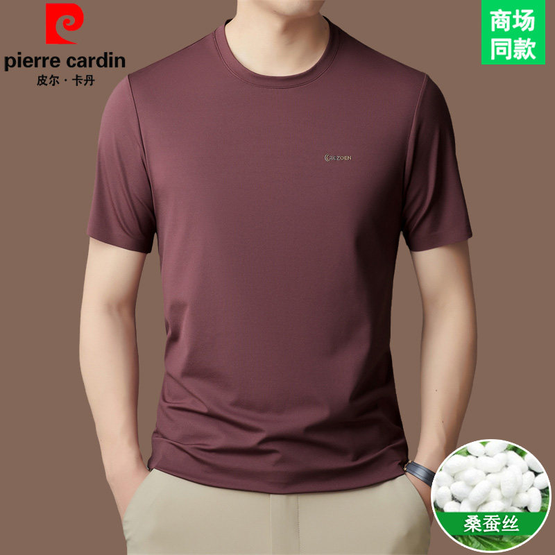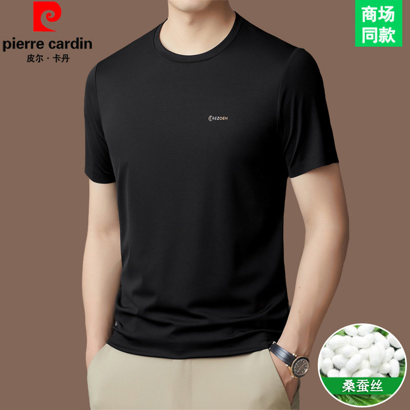 皮尔卡丹圆领短袖t恤男高端商务休闲体恤桑蚕丝夏季纯色半袖男装