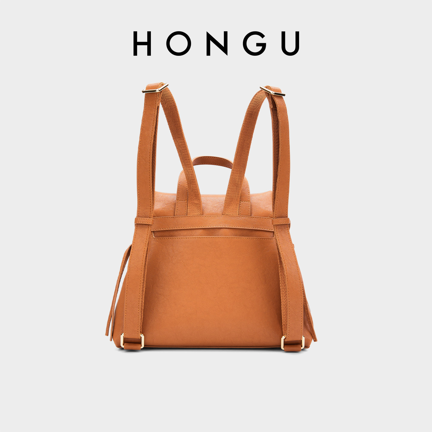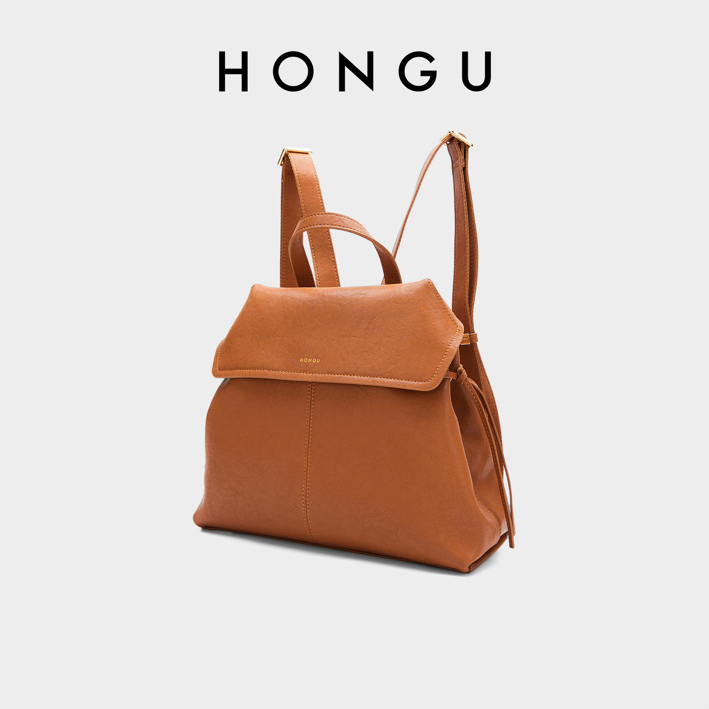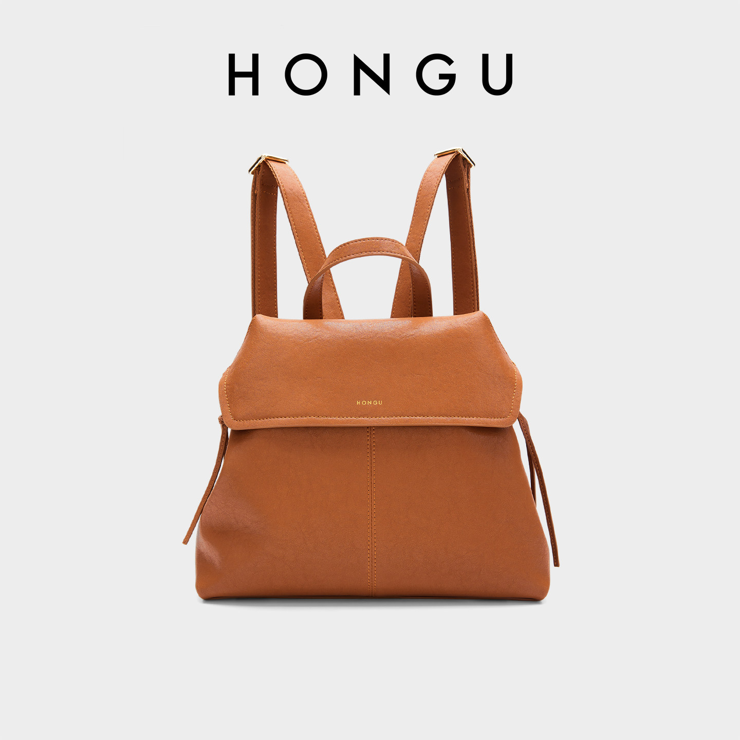 红谷植鞣皮双肩包女大容量通勤真皮背包棕色翻盖书包时尚H5197170