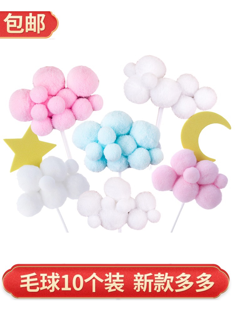 云朵生日蛋糕装饰毛球云朵网红插件月亮白云彩虹蛋糕摆件插旗