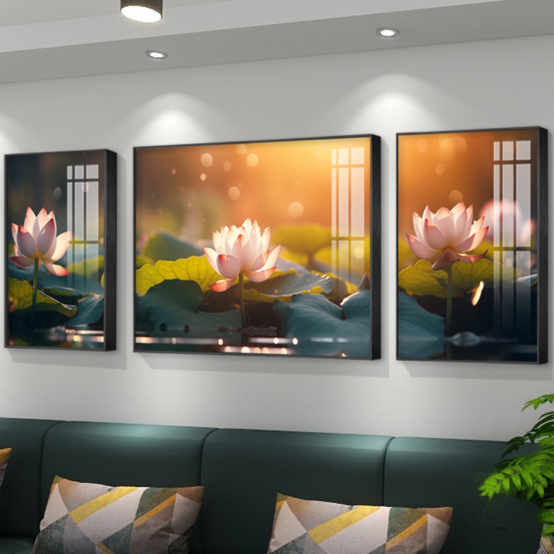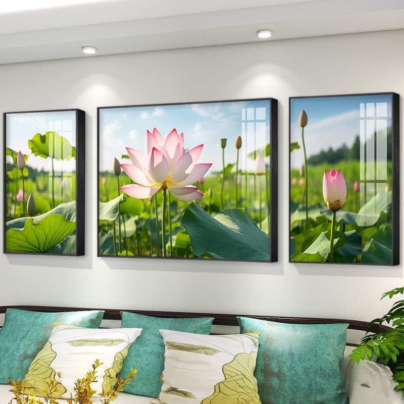现代简约沙发背景墙装饰画轻奢高档新款客厅创意三联挂画荷花壁画