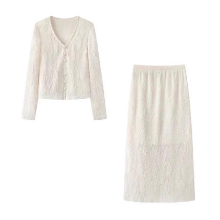 B122红系列法式甜美雪纺衫剪花流苏开叉半身裙+正肩V领短上衣