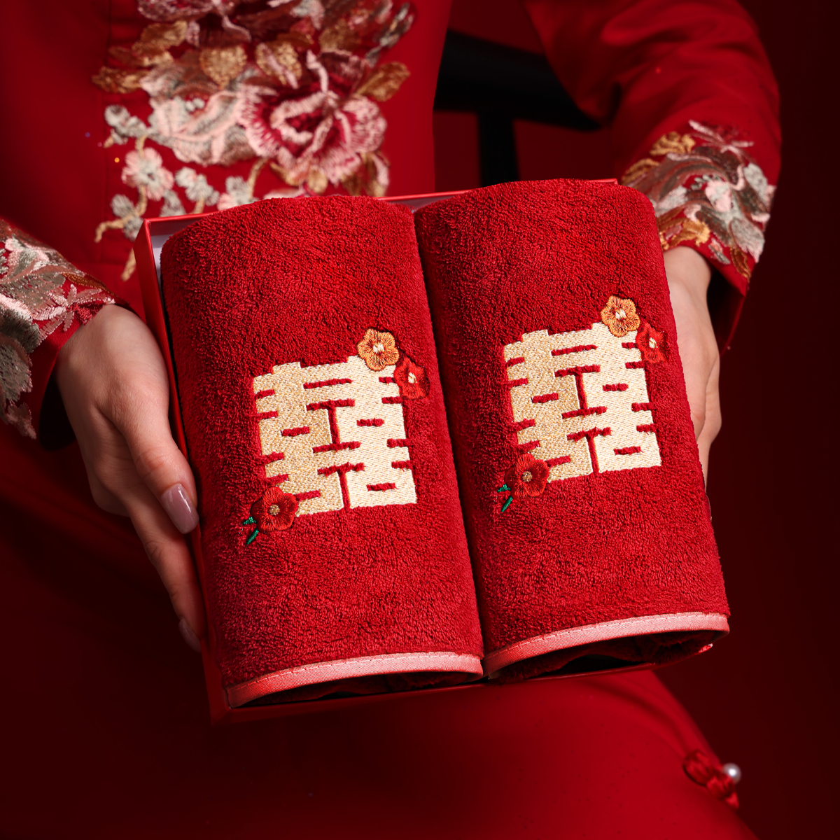 洁丽雅纯棉红毛巾一对喜字回礼
