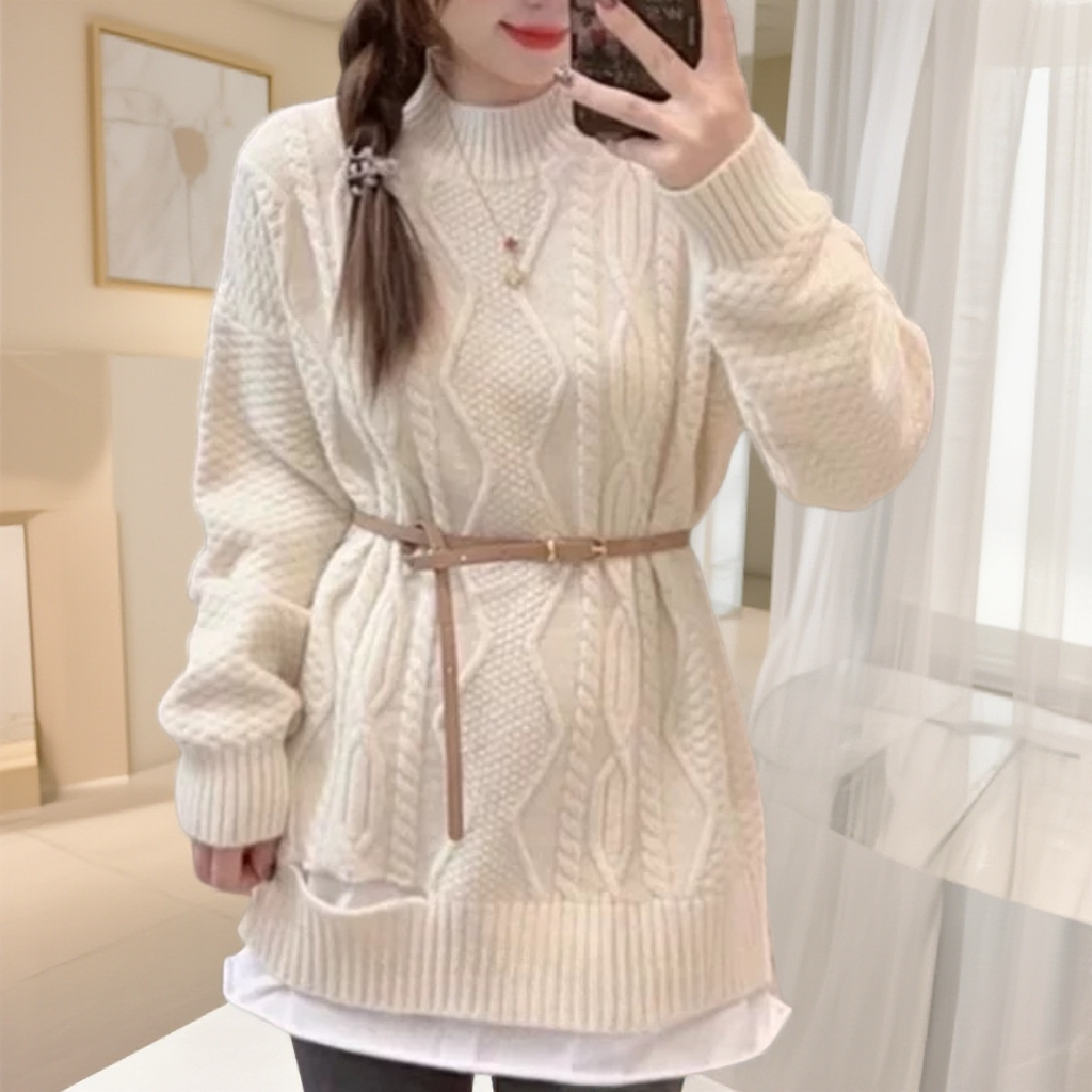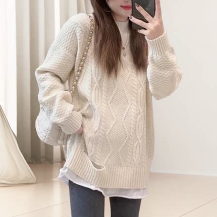 白色麻花毛衣女秋冬宽松慵懒风加厚菱格复古套头针织上衣