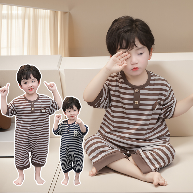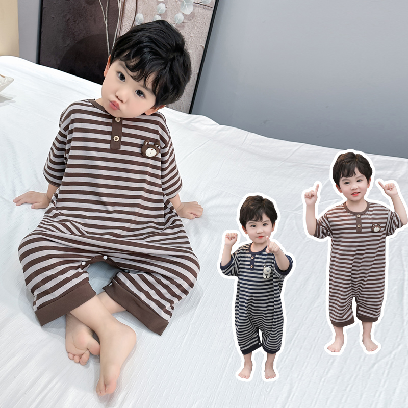 男童睡衣夏季款莫代尔条纹小熊短袖爬服儿童家居服连体宝宝空调服