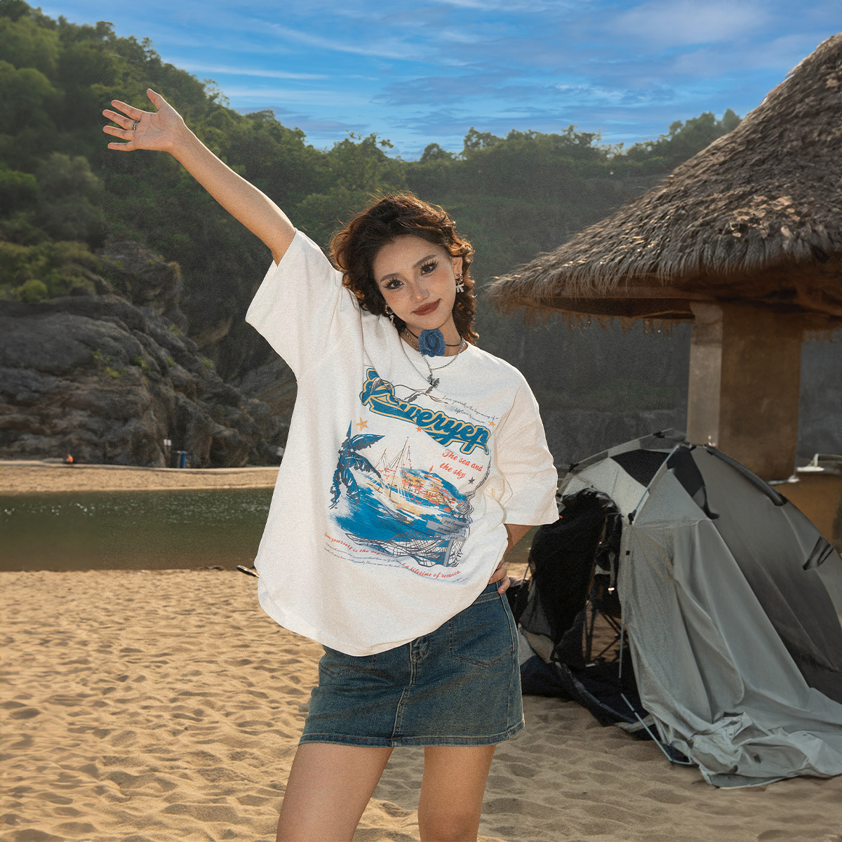 YEP复古白色印花t恤女2025新款夏季潮牌纯棉短袖上衣宽松百搭半袖
