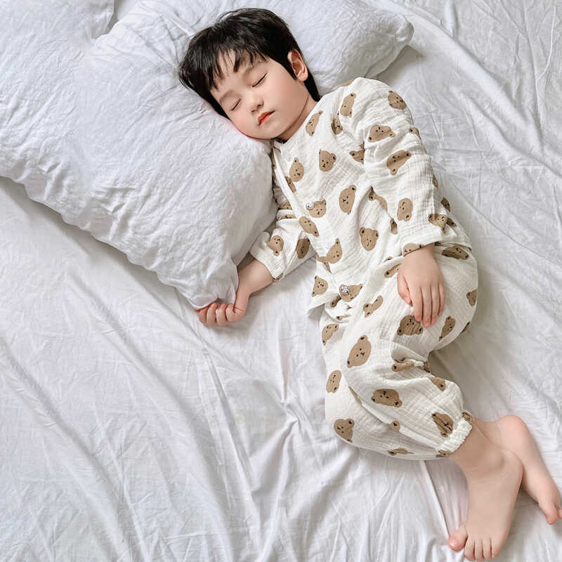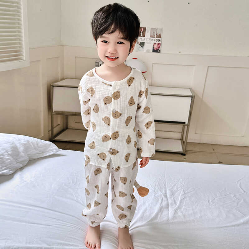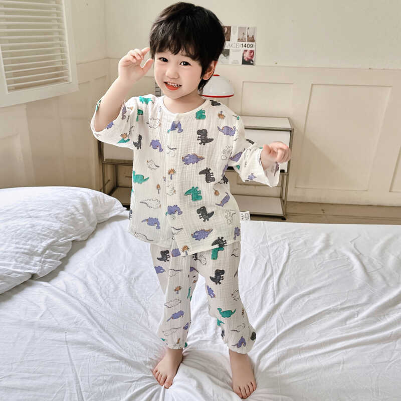 儿童睡衣夏季薄款双层棉纱布男女童家居服开衫洋气印花休闲空调服