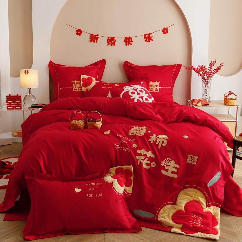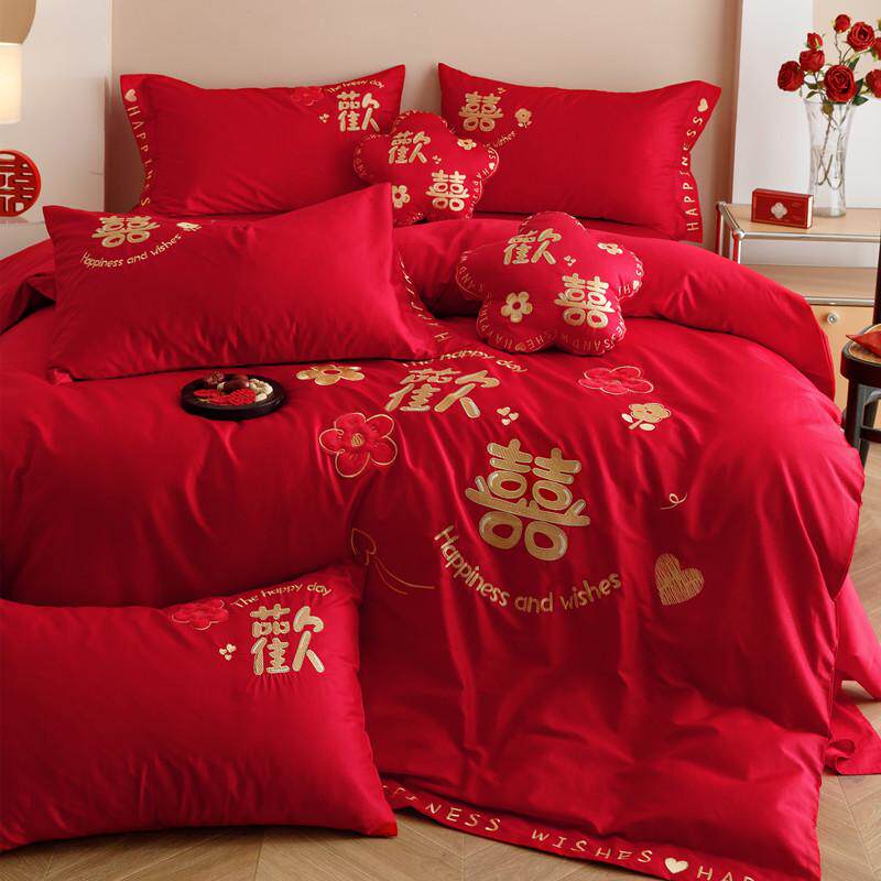 9v7t中式婚庆四件套结婚大红简约喜字被套床单房新婚喜被床上