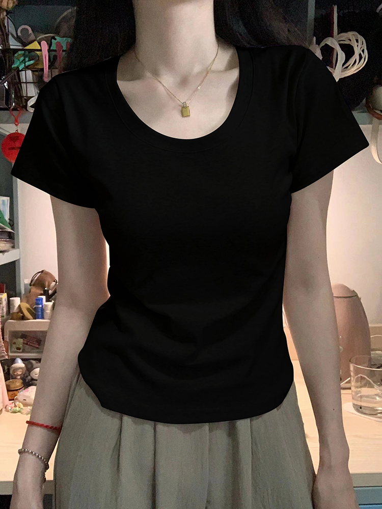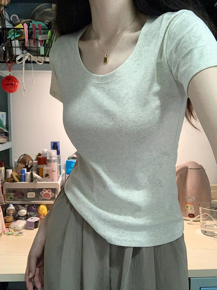 露锁骨u领正肩短袖t恤女夏季2024新款修身打底衫美式辣妹短款上衣