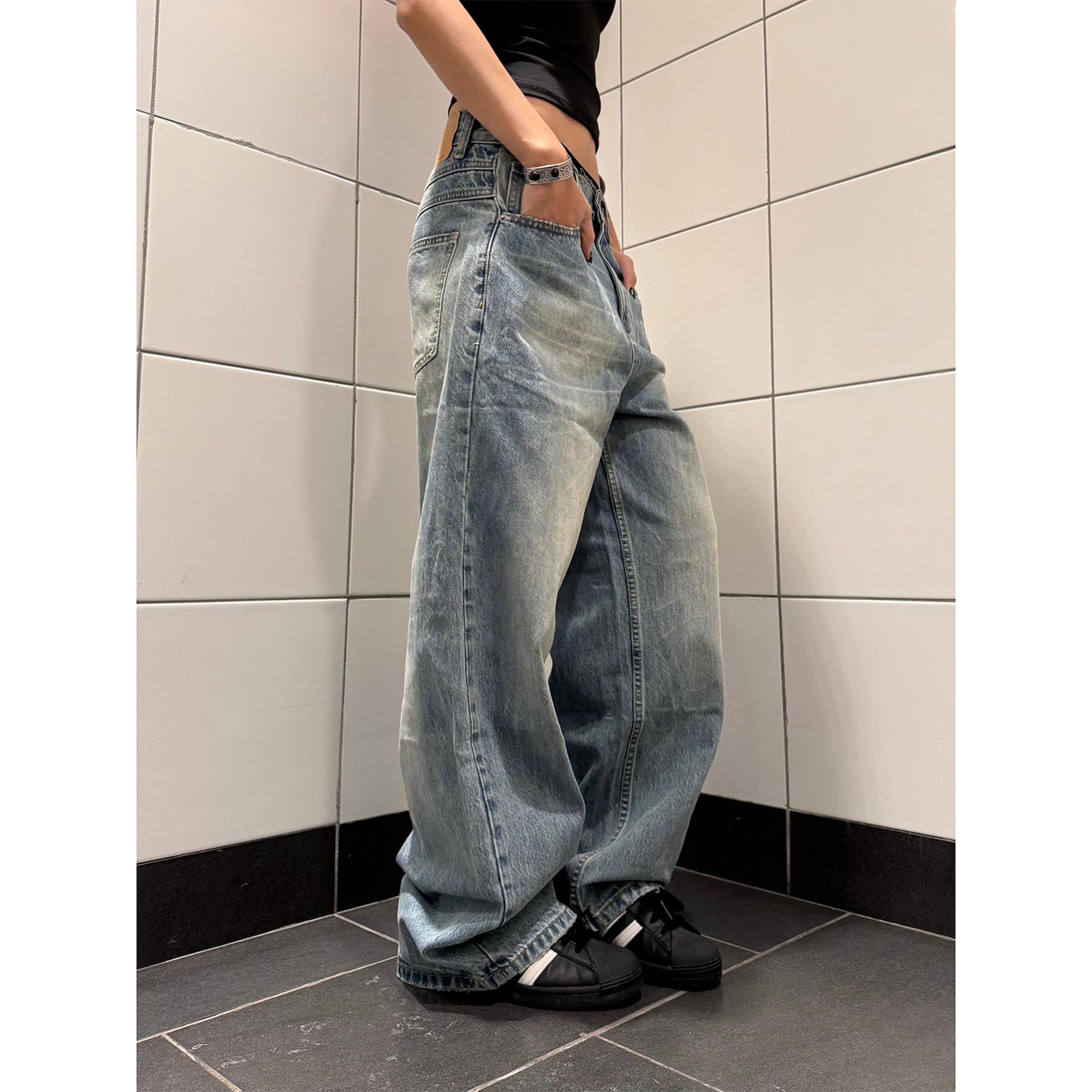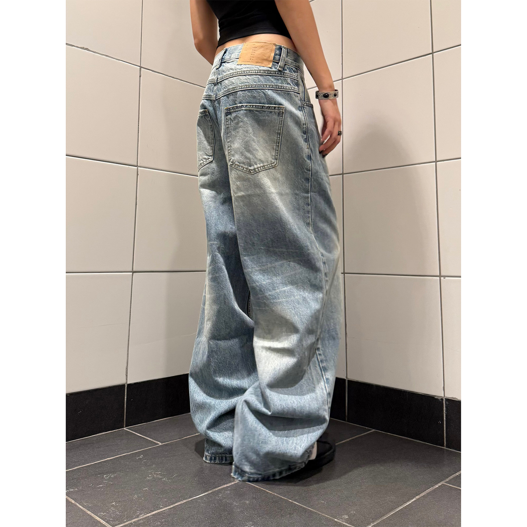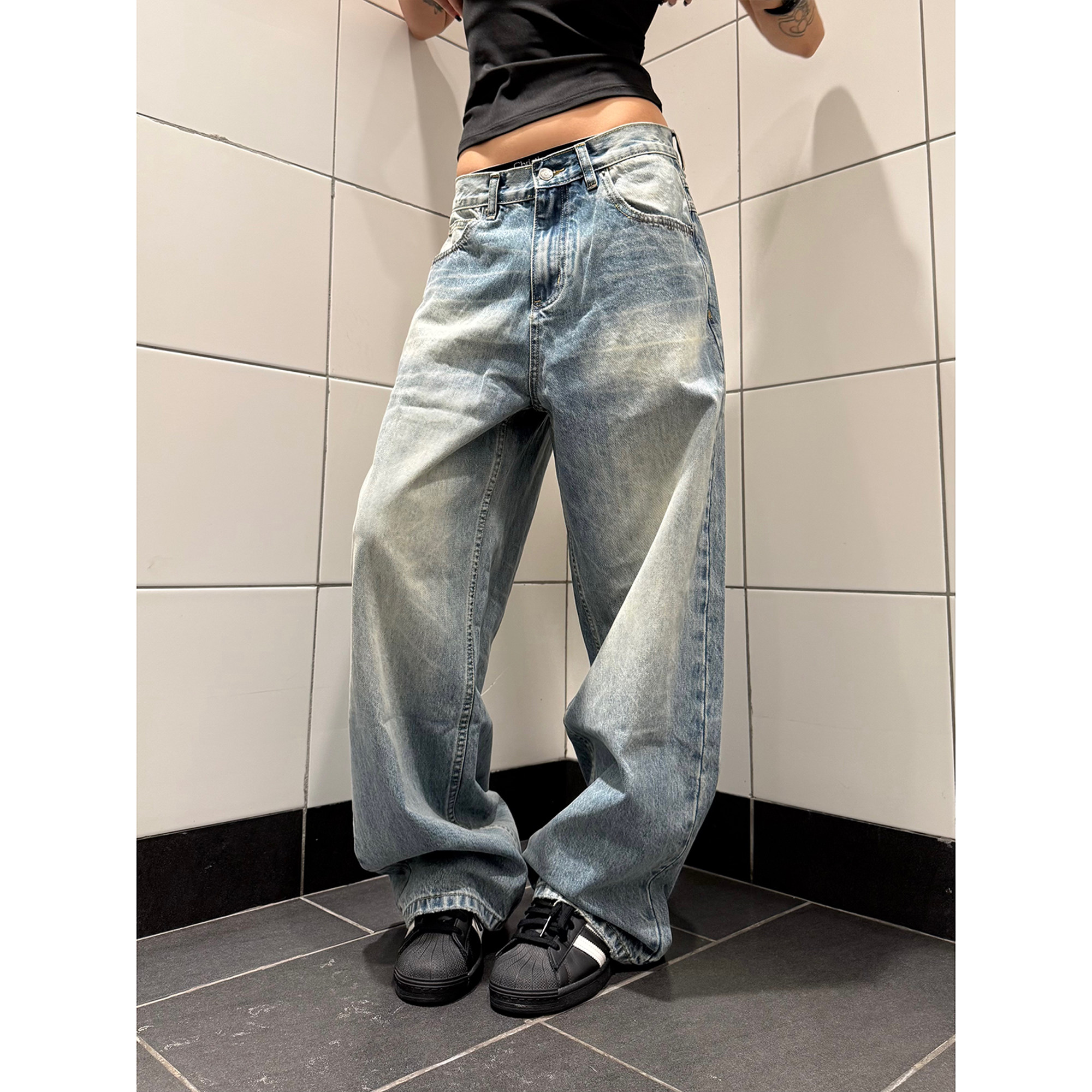 F383 美式复古猫须渐变直筒牛仔裤男女宽松百搭休闲阔腿拖地长裤