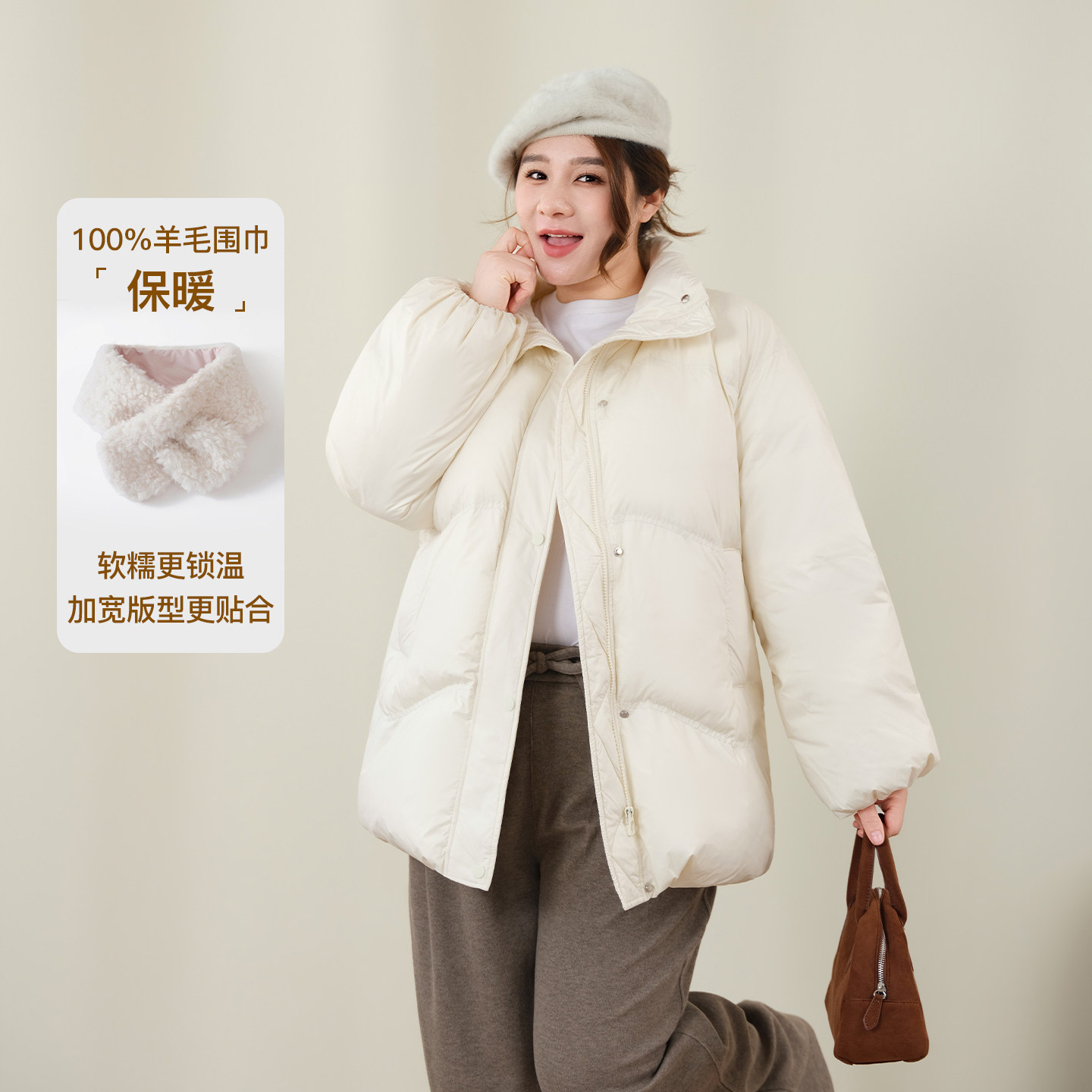 YUZI鱼子90白鹅绒羽绒服轻奢甜美减龄宽松冬厚外套赠围巾大码女装